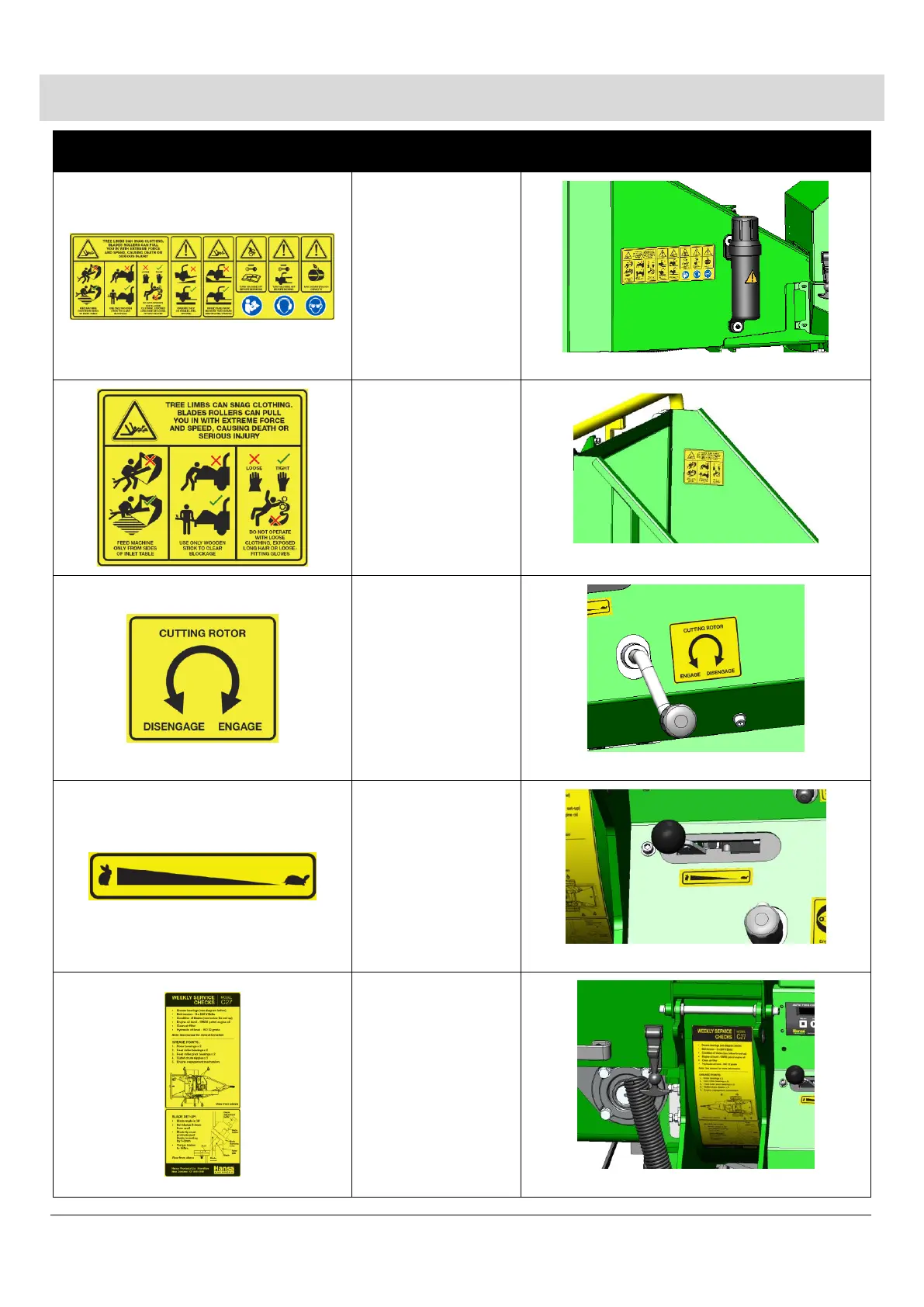 Hansa C40 - Decals: Safety and Controls; General Machine Safety Decals; Control Operation Decals; Service Indicator Decals