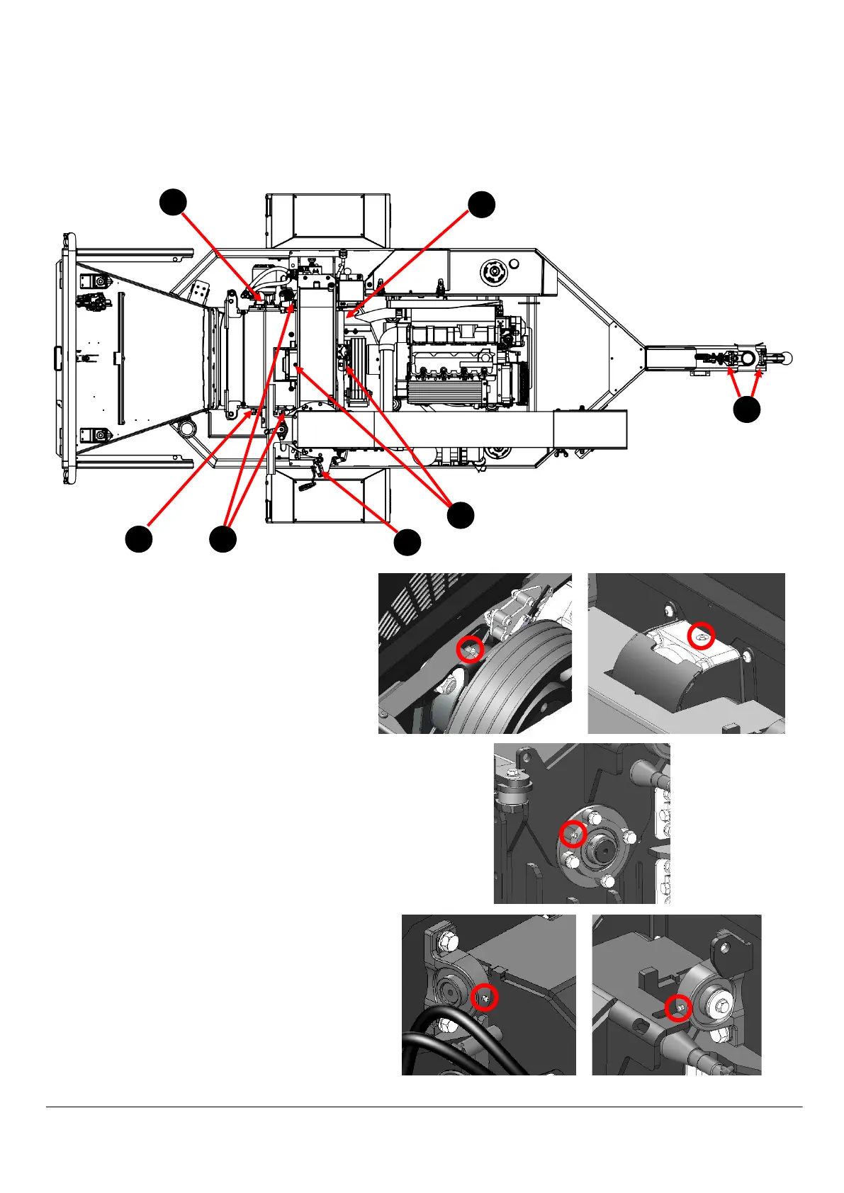 The grease points listed below must be greased every 50 operating hours with bearing grease or all-purpose grease: