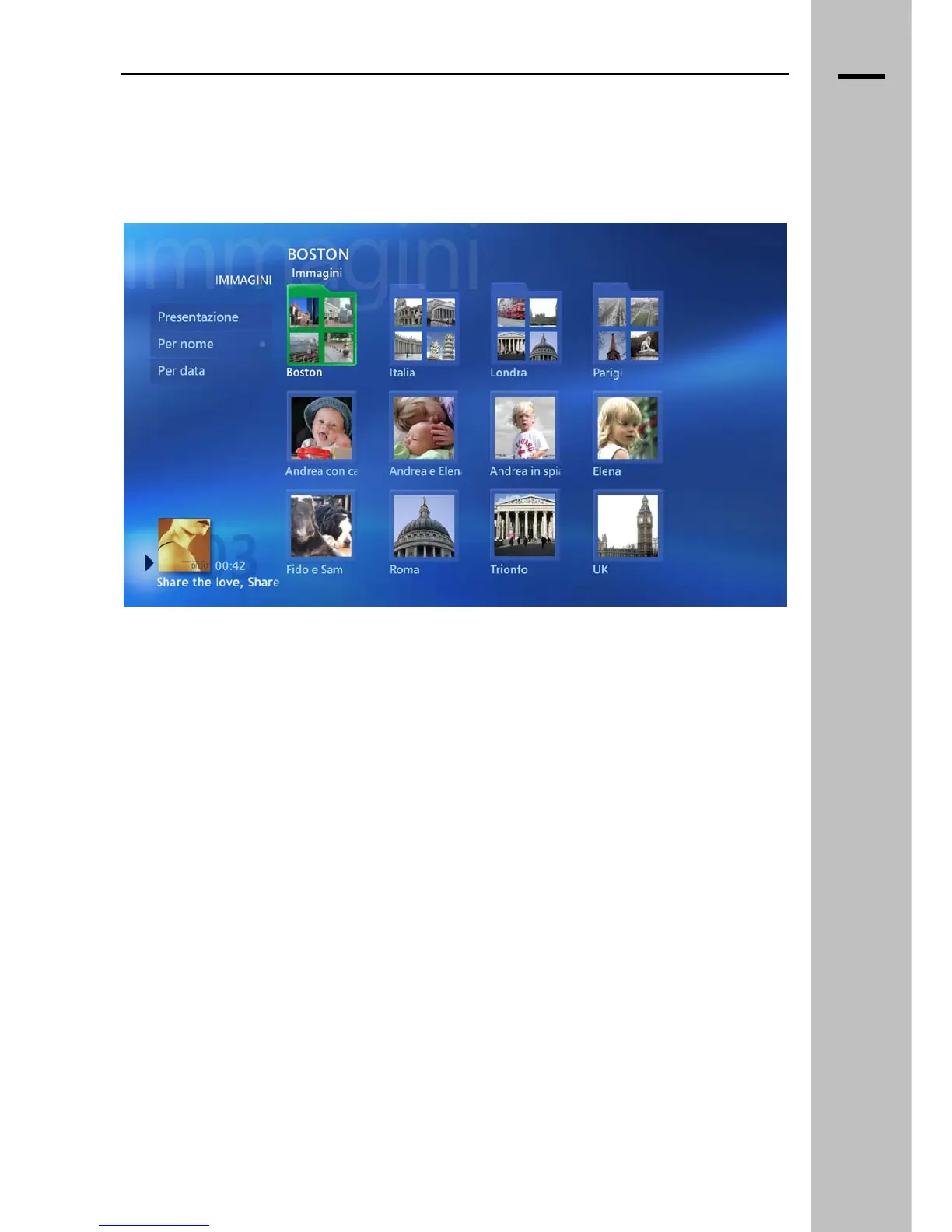 visualizzate nella schermata principale. Per spostarsi fra il menu e le anteprime o le cartelle,