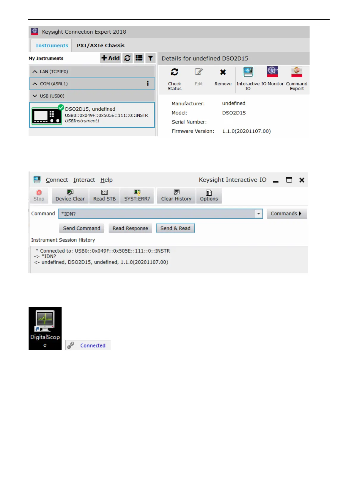 Click "Interactive IO", send an instruction arbitrarily, and the computer and the oscilloscope will