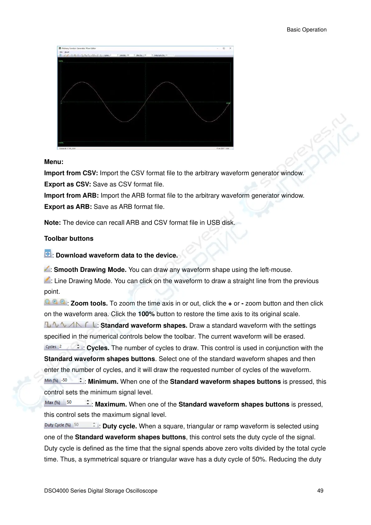 Import from ARB: Import the ARB format file to the arbitrary waveform generator window.
