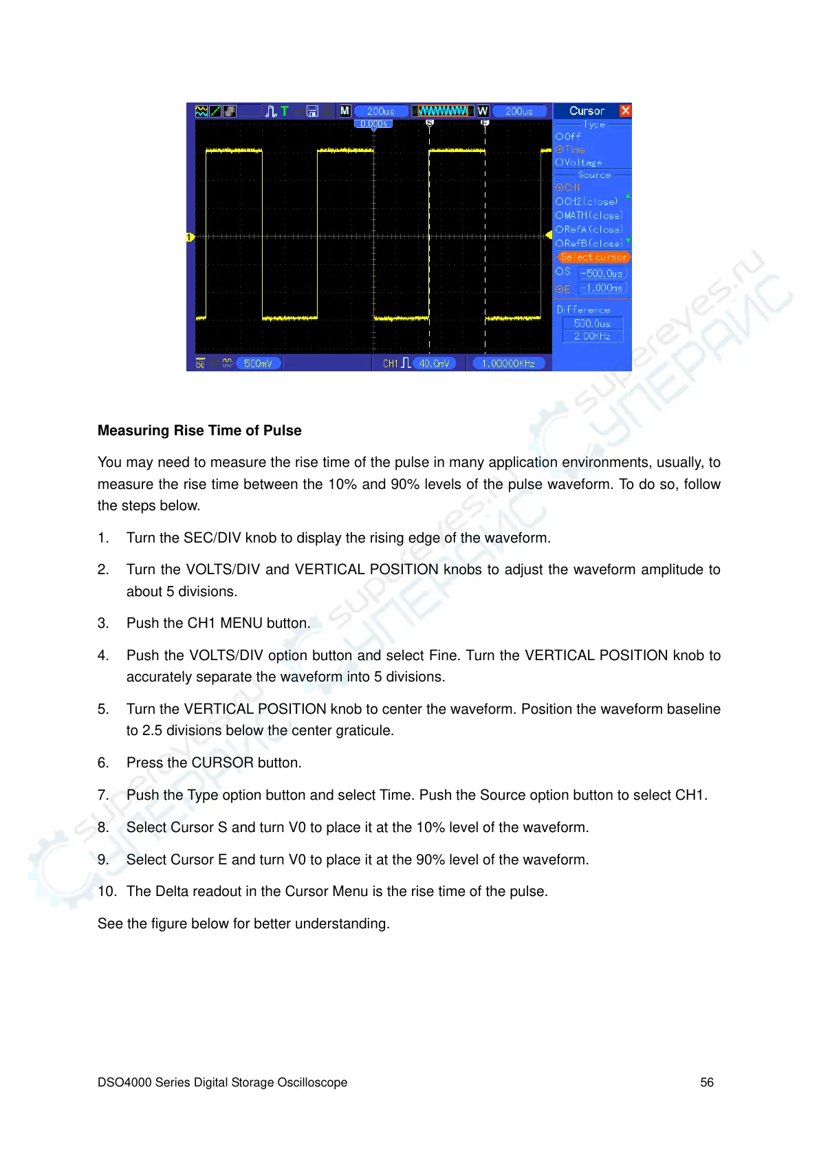 10. The Delta readout in the Cursor Menu is the rise time of the pulse.