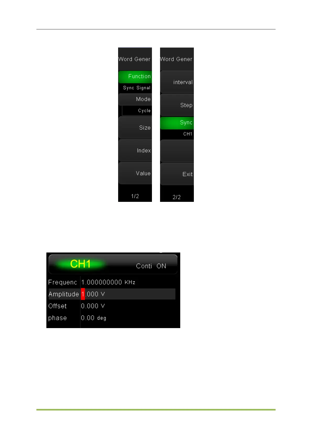 3. Open CH1 waveform output, Select the Signal Type to "Sine ", frequency to “1KHz”, Amplitude
