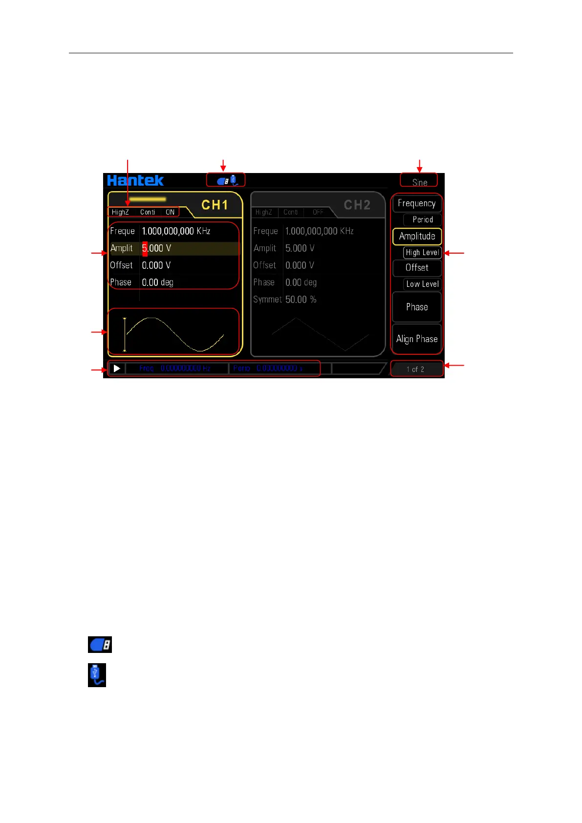 The signal generator can be divided into three regions: the status panel at the top of the screen,