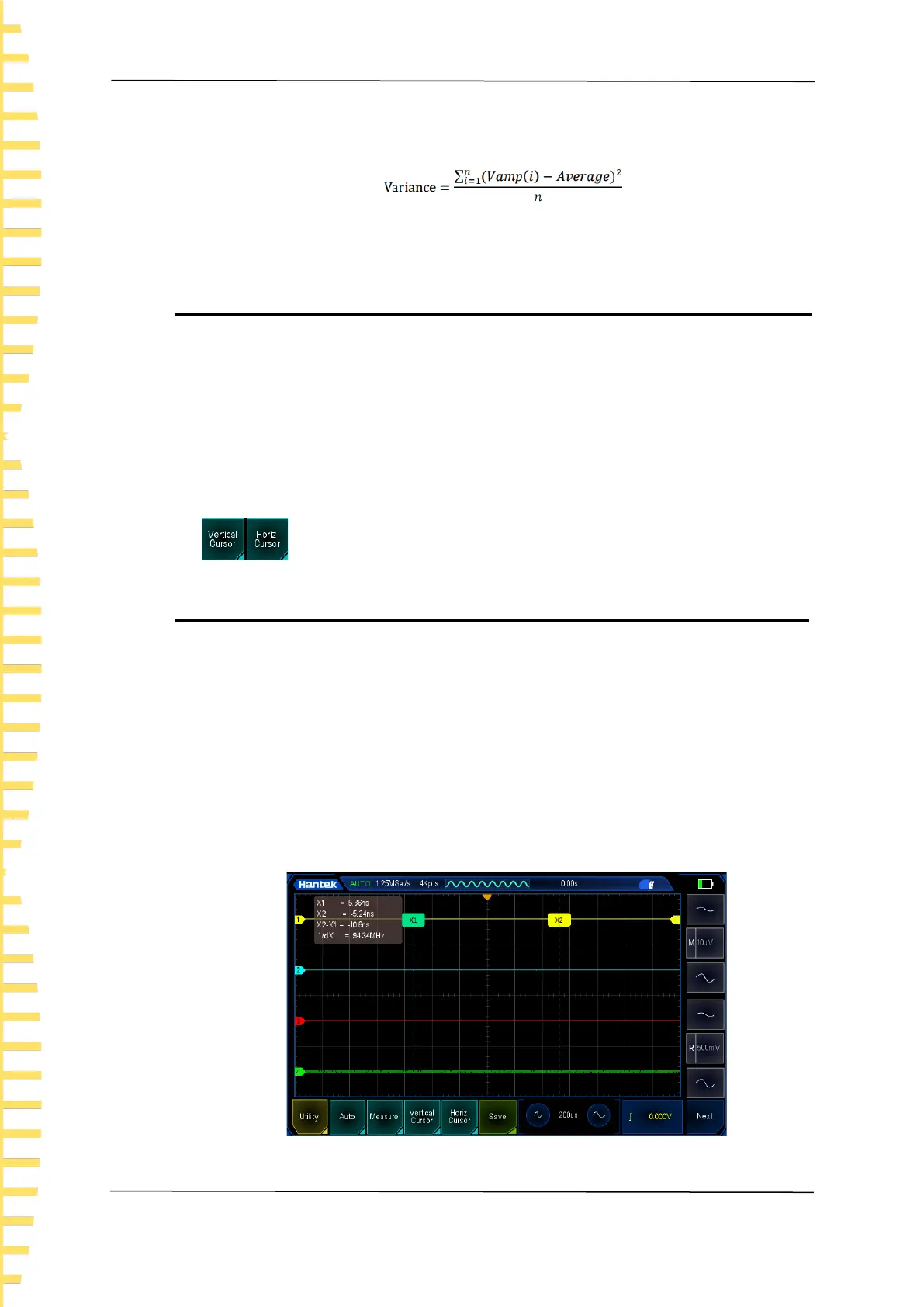 Horizontal cursor: The amplitude cursor, displayed as a horizontal dashed line, is used to