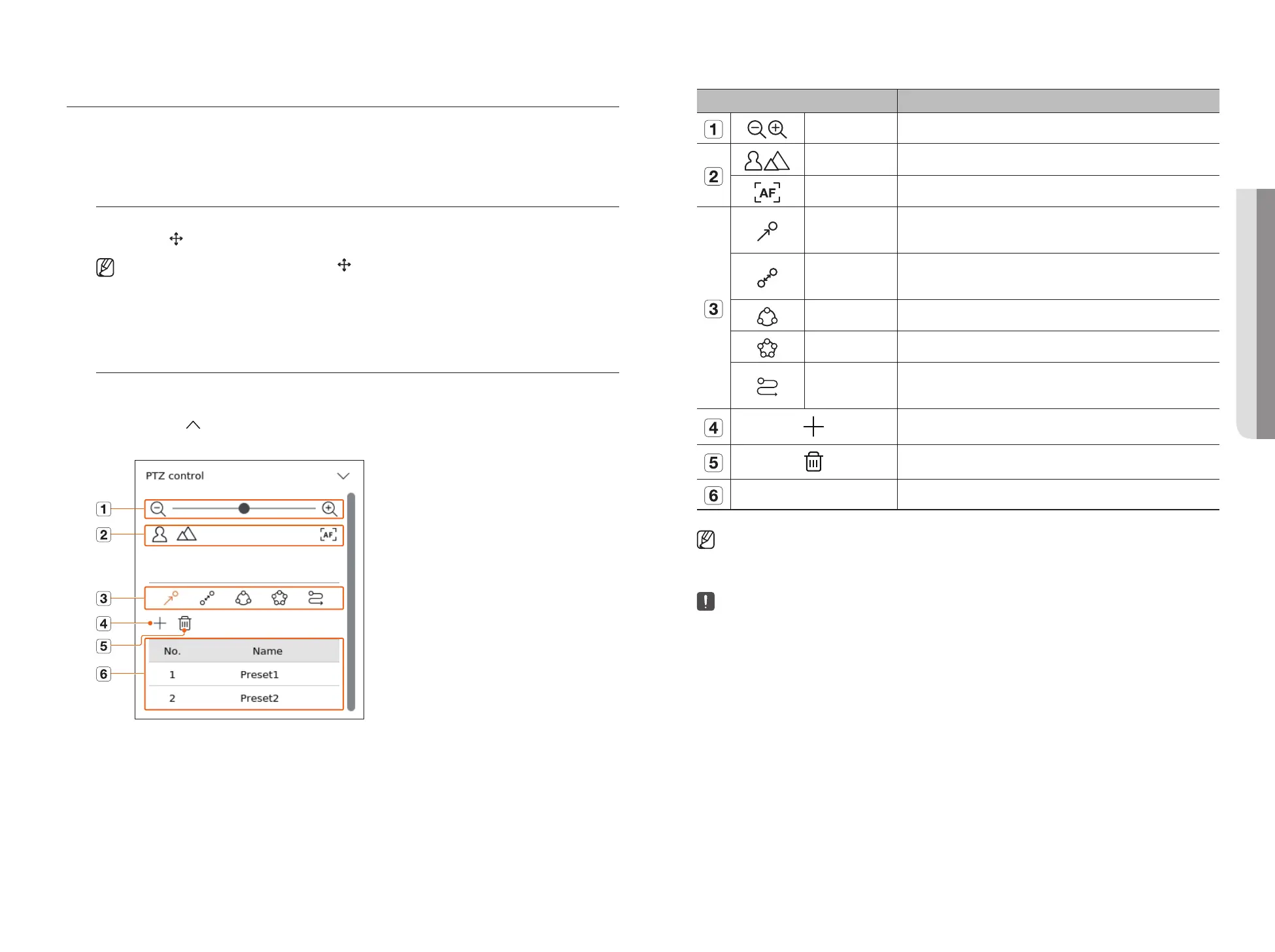 Zoom out/Zoom in Activate the Zoom operation of the PTZ camera.