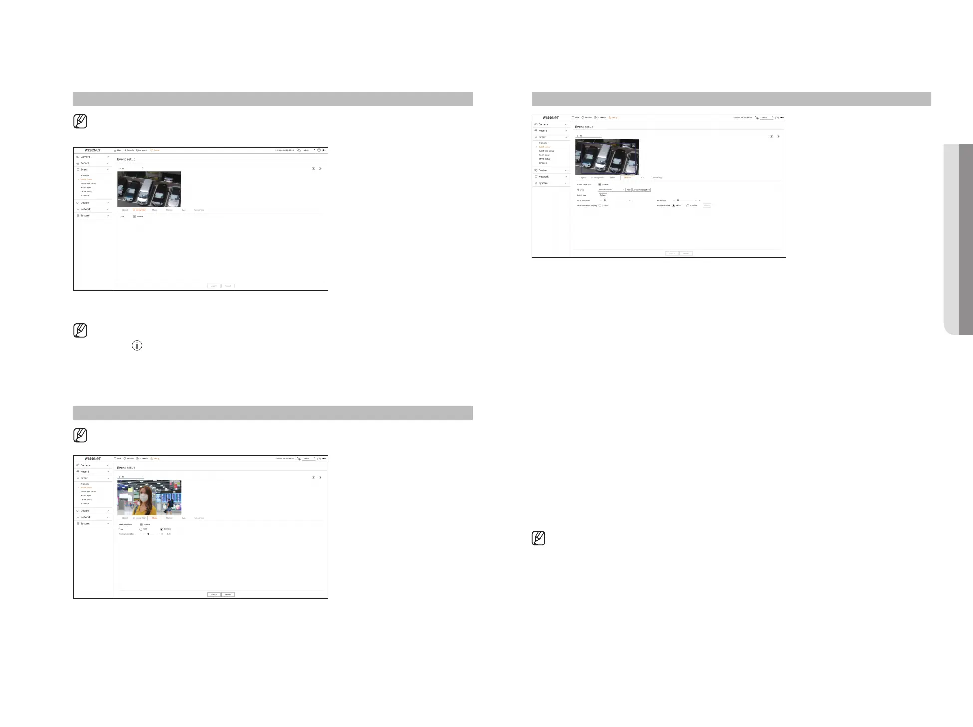 The settings for Mask detection may vary depending on the recorder model or the connection of Wisenet AI camera.