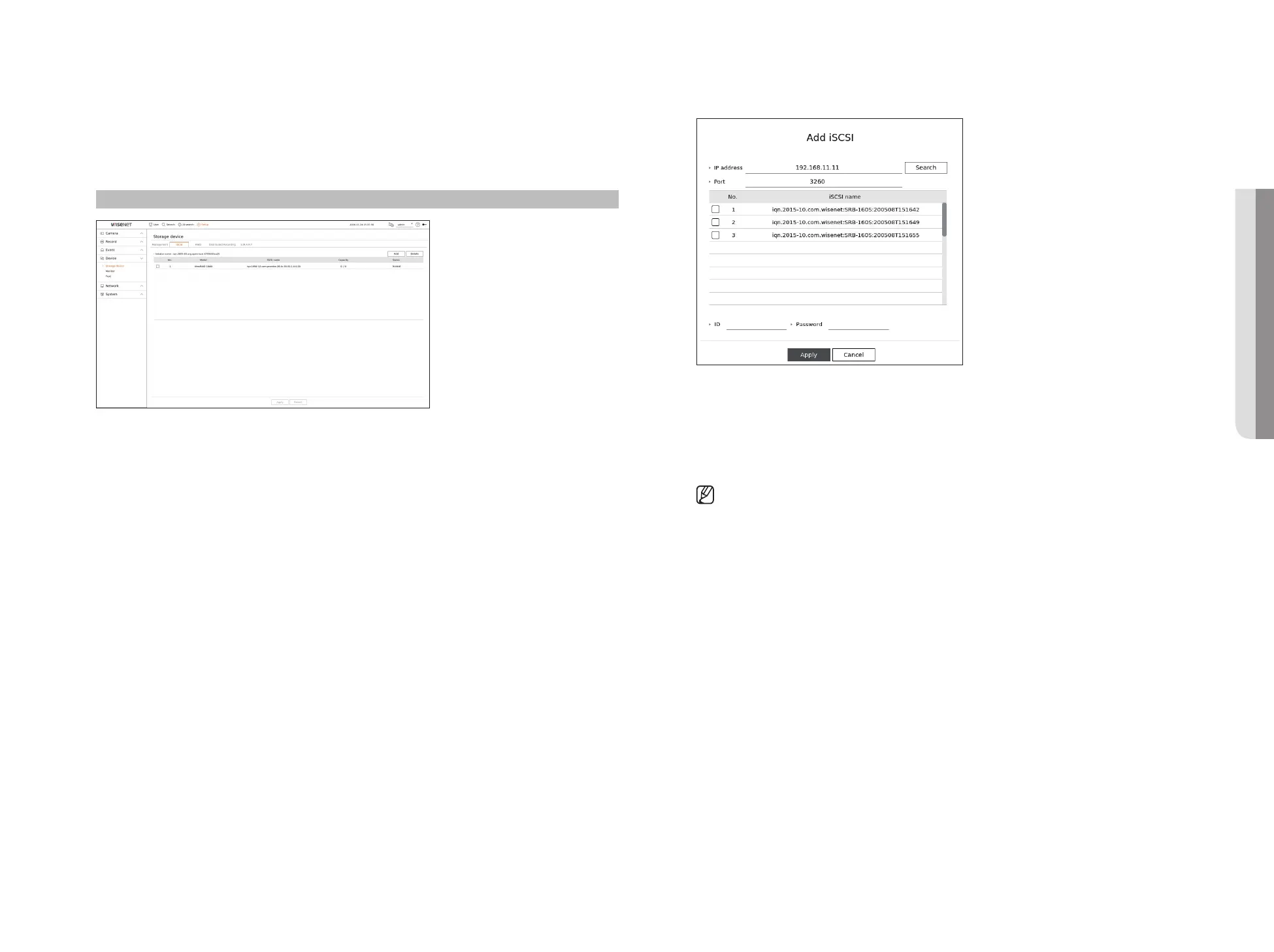 When connecting an iSCSI device to the recorder, you can search for the iSCSI device and connect and disconnect