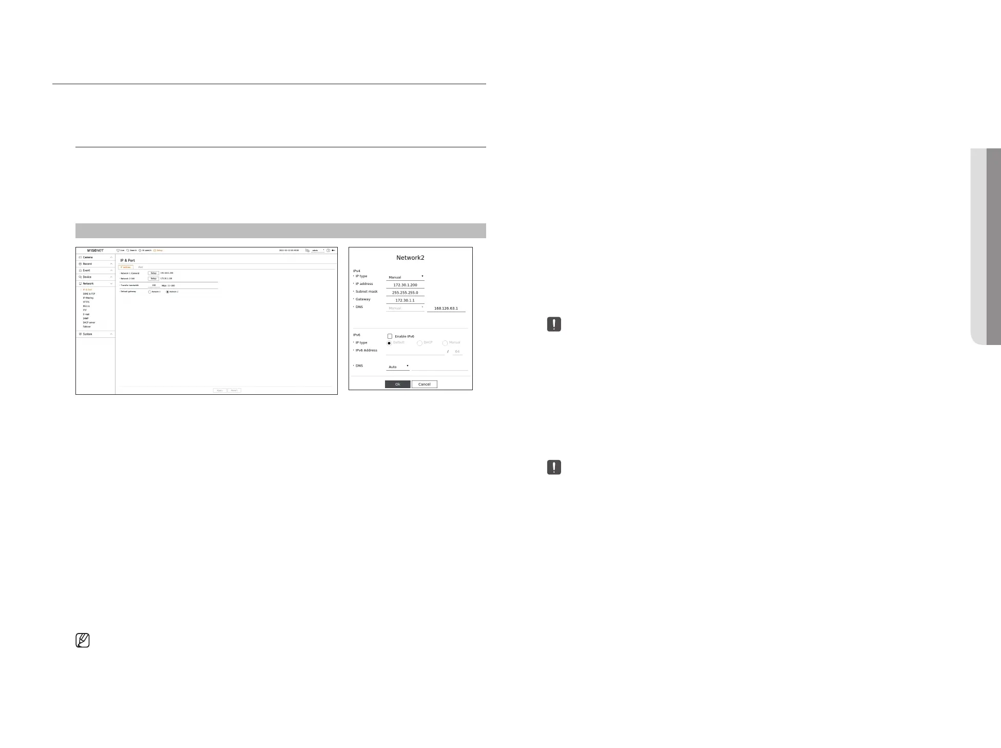 – Network Settings : Set the <IP type> of the connected recorder to <Manual>.
