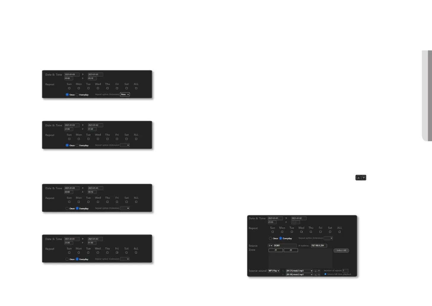 If you set the date (2021-01-01 / 2021-01-02), time (23:00 / 01:00), <Everyday>, the broadcast schedule is set up