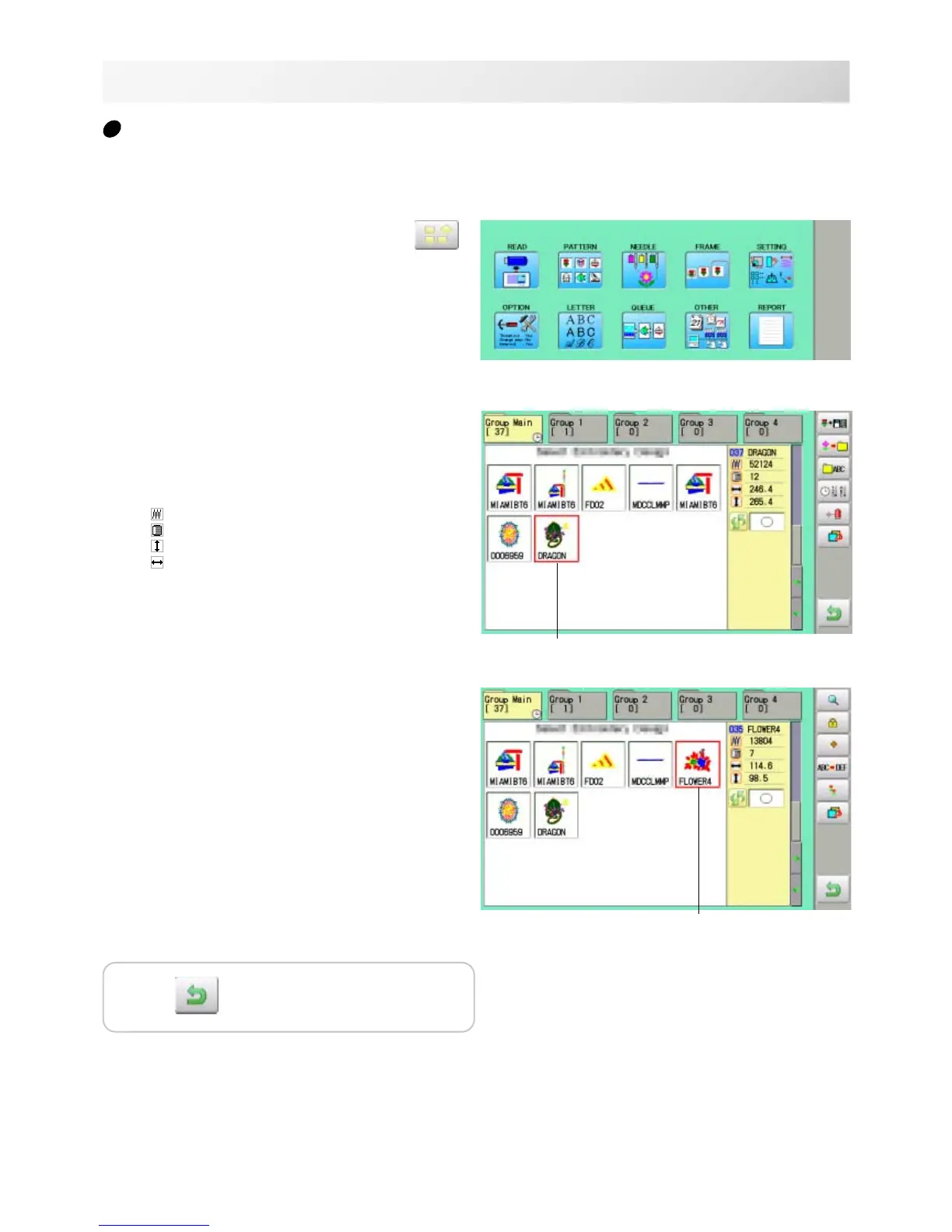To select an embroidery design previously stored into the machine memory.