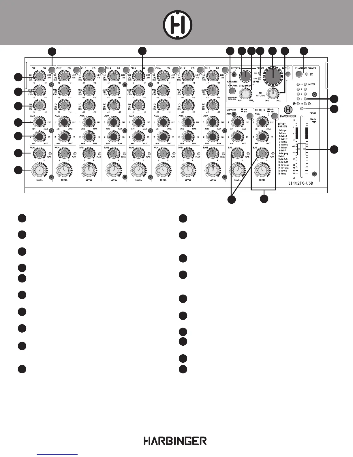Mid EQ: A peaking EQ control, boosting or cutting frequen-