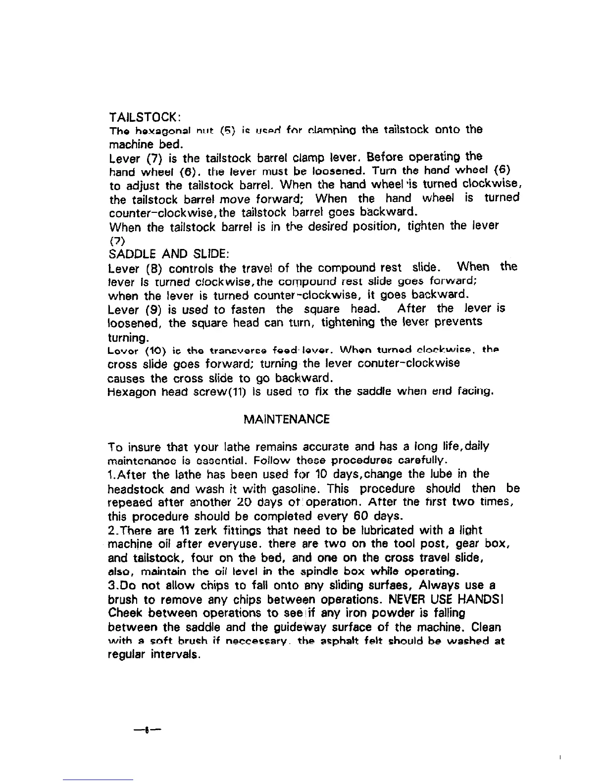 Harbor Freight Tools 31316 - Component Operation and Maintenance; Tailstock and Saddle;Slide Operation; Maintenance Procedures