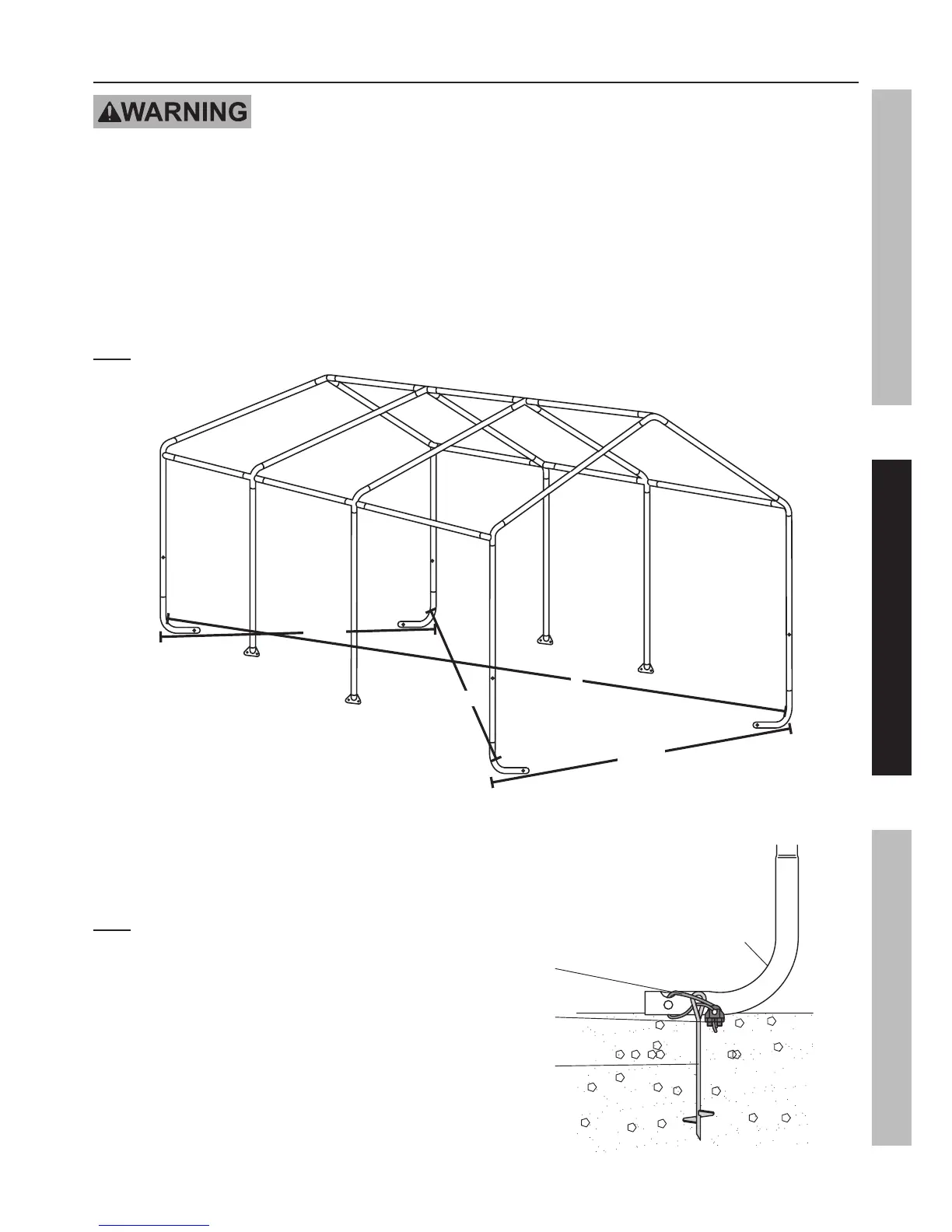 4. Once the frame is positioned, leveled, and squared, anchor the four Corner Legs (23) as follows: