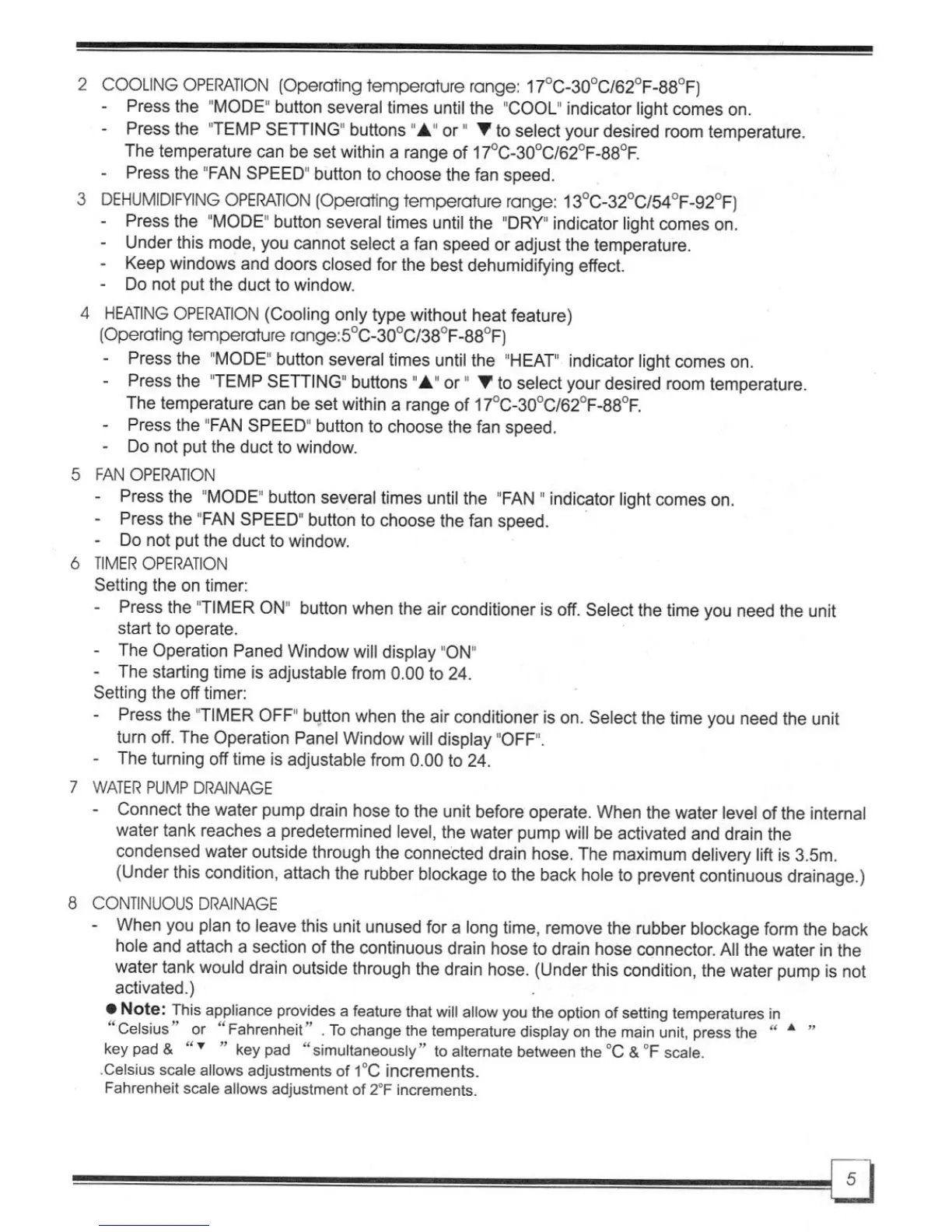 Harbor Point HP12CP - Cooling Operation; Dehumidifying Operation; Heating Operation
