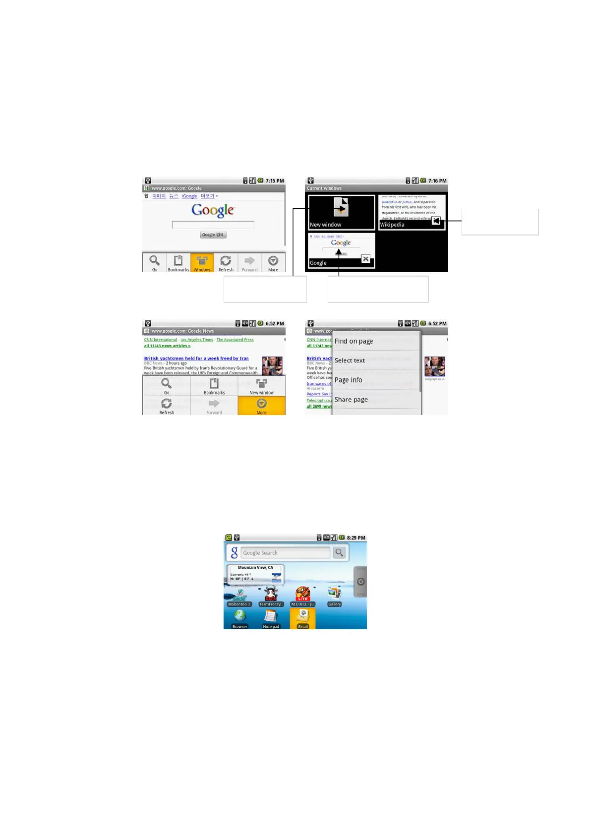While viewing a web page, press MENU and then touch More. More menus are Find on page/select text/Page info/Share page/Downloads/Settings