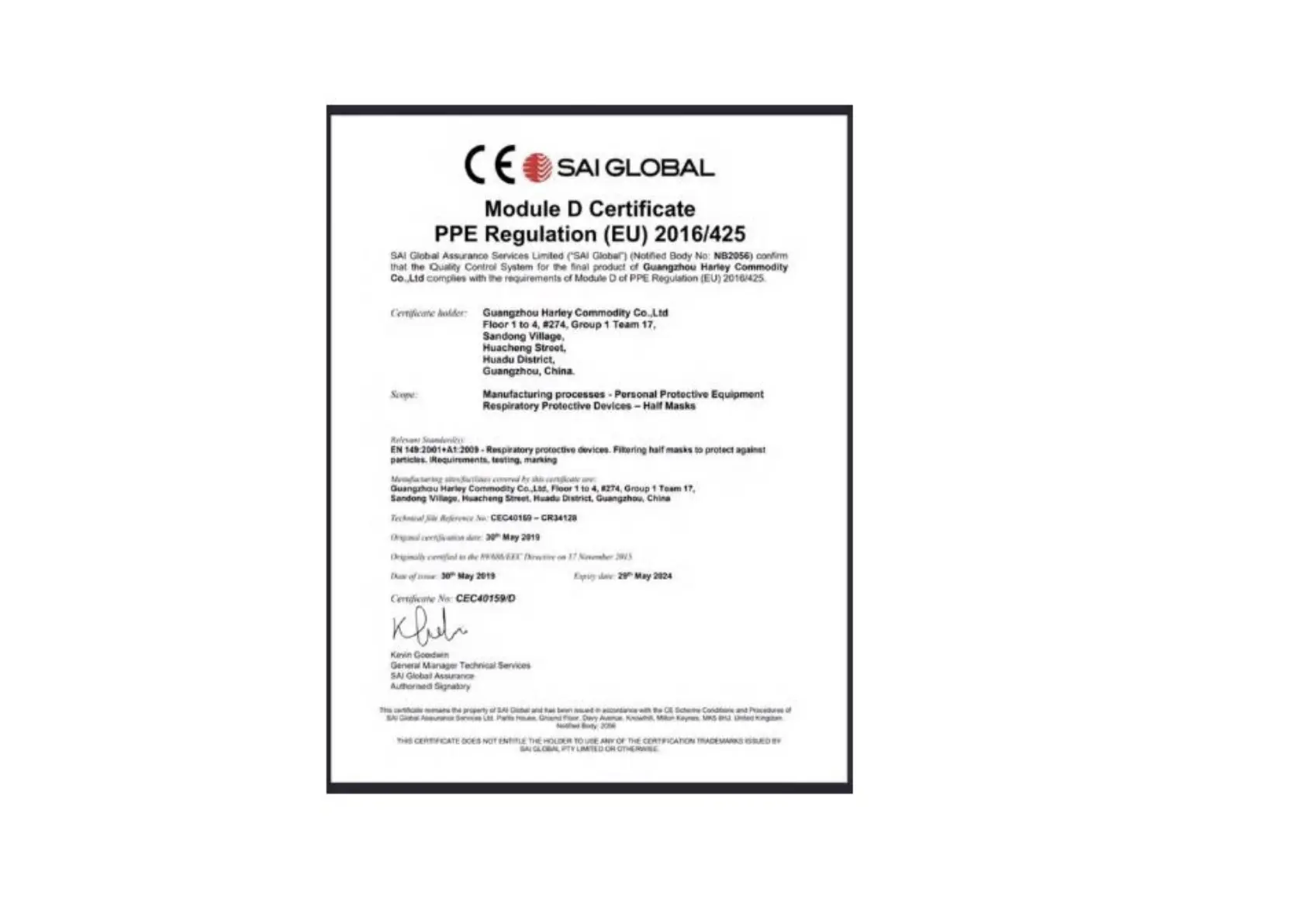 Harley Commodity L-188 - EU PPE Regulation Certificate; Module D Certificate Details