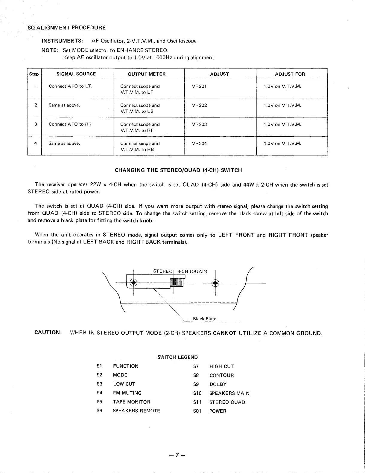 Harman Kardon 800+ - SQ ALIGNMENT PROCEDURE; SQ Circuit Alignment; Changing Stereo;Quad Switch