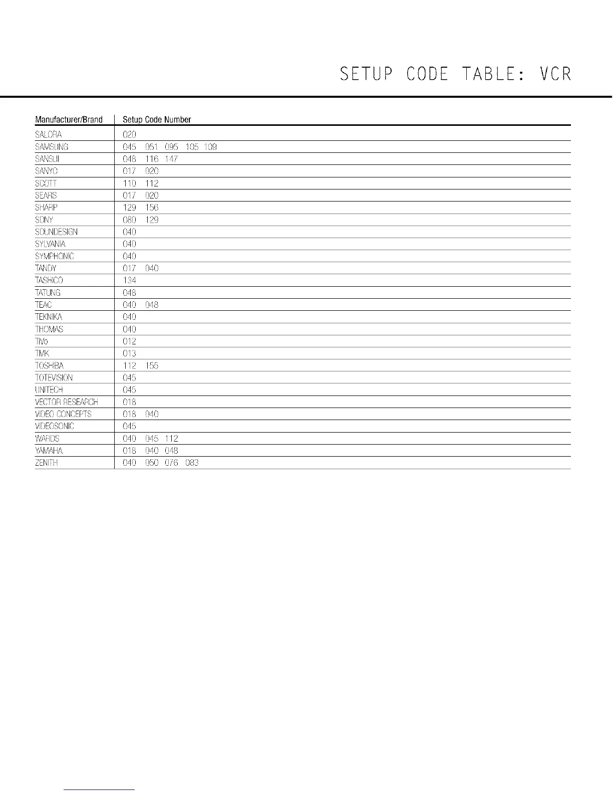 SETUP CODE TABLE: VCR