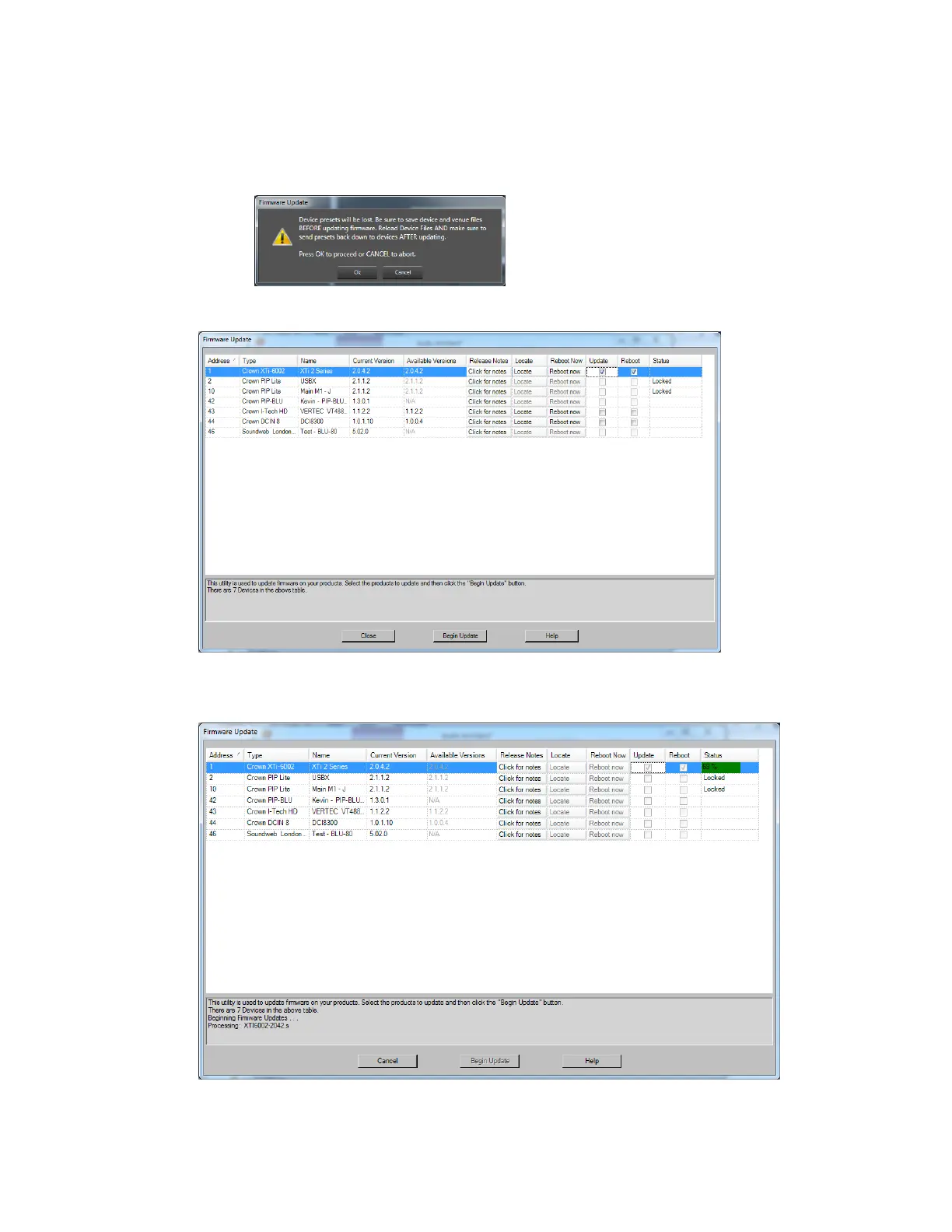 Harman CROWN CDi Series - Initiate Firmware Update; Select Amplifier for Update; Monitor Firmware Reloading