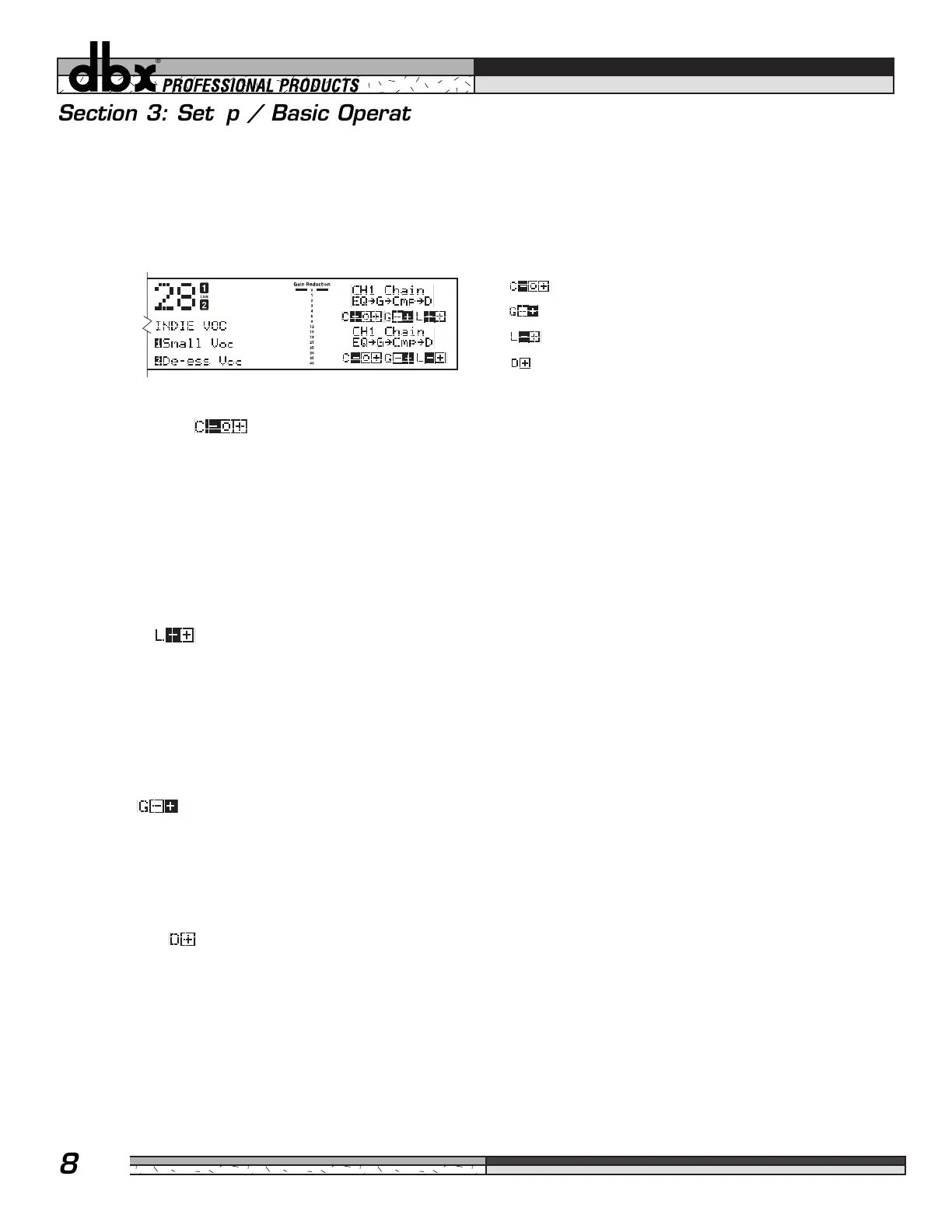 section, the plus (+) sign will darken, and gain reduction will begin to occur as a result of the signal