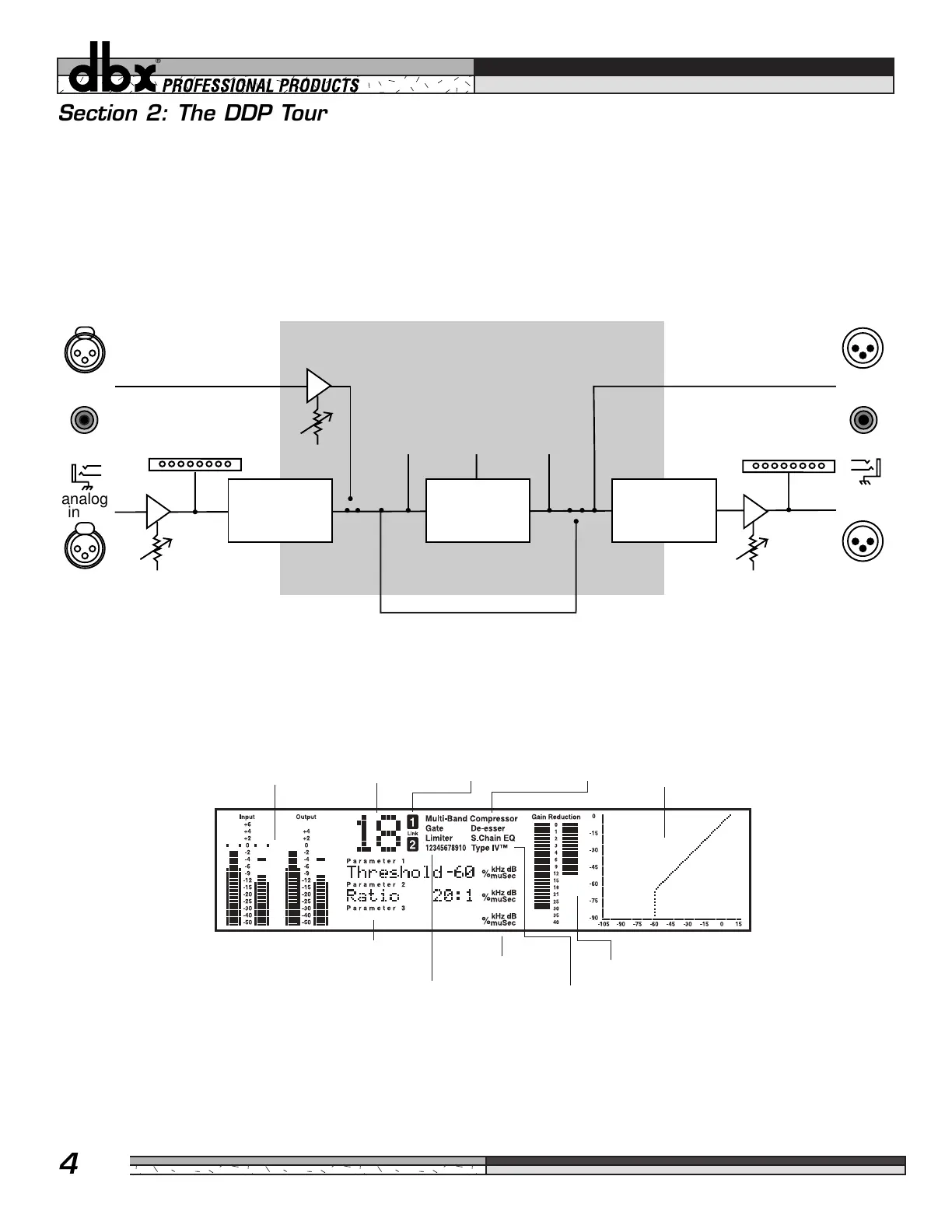 The following simple illustrations show how audio signal flows through the DDP, and how the LCD display