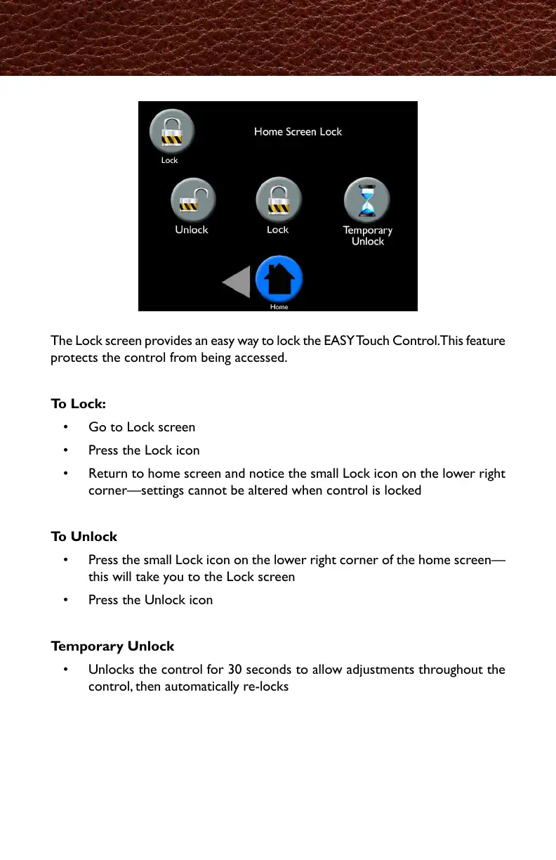 The Lock screen provides an easy way to lock the EASY Touch Control. This feature