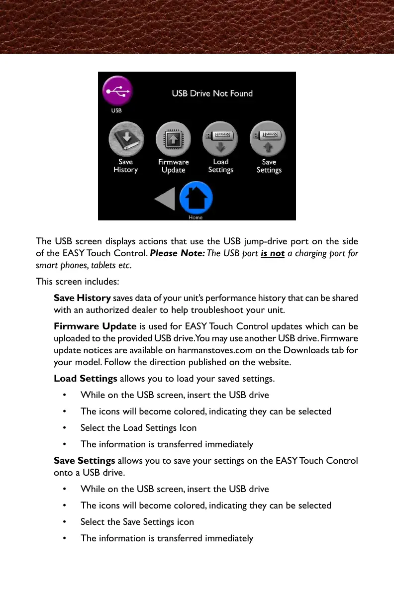 of the EASY Touch Control. Please Note: The USB port is not a charging port for