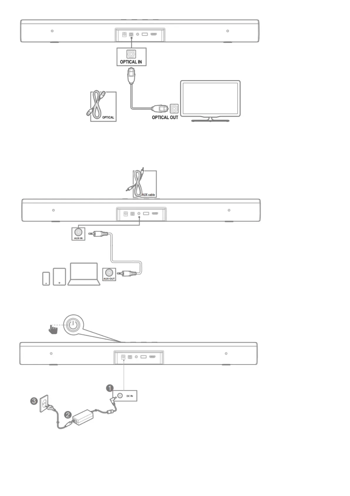 on your soundbar to the AUX IN/ 3.5mm connectors on your portable devices.