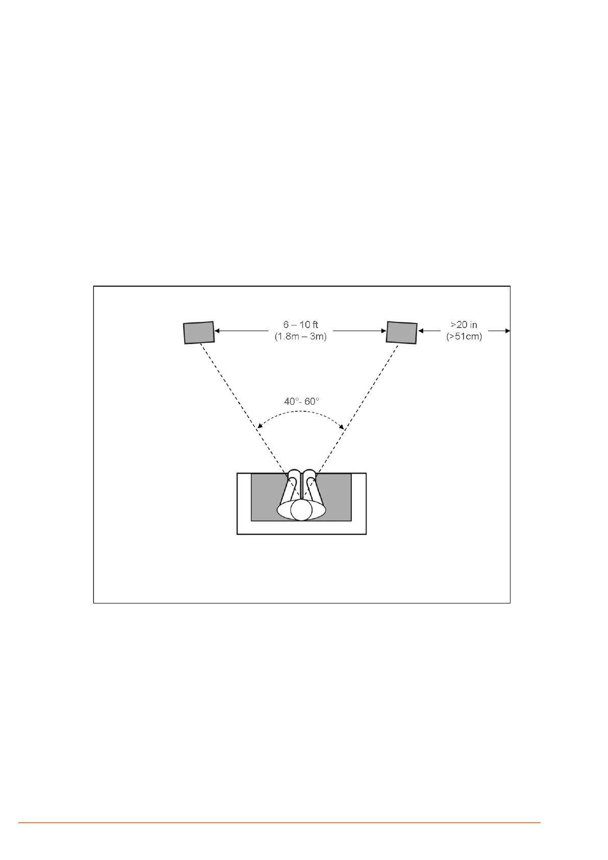 For the best results, place the speakers 6 – 10 feet (1.8m – 3m) apart. Angling the speakers toward the listening position