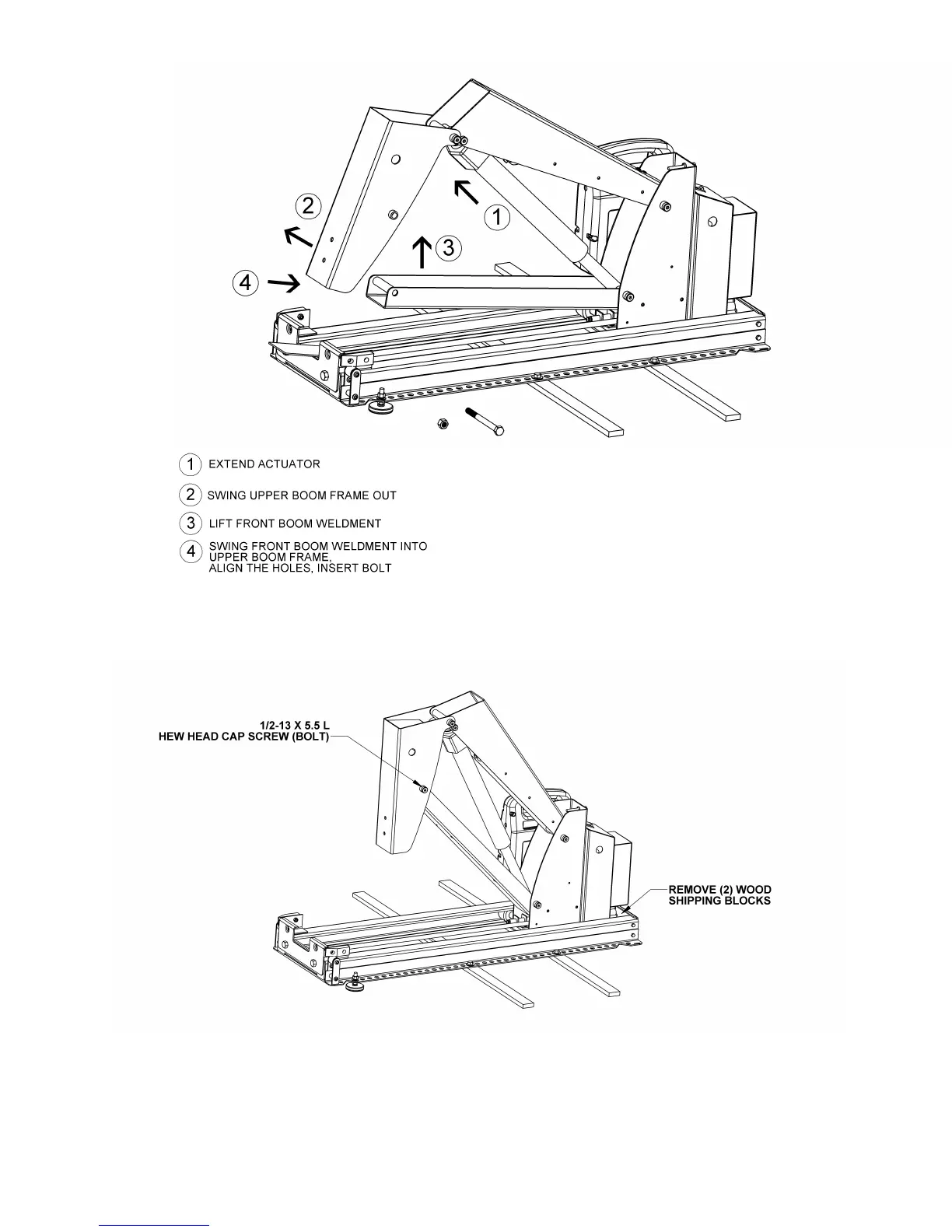 After the actuator is extended, lift the Front Boom Weldment and swing the Upper Boom Frame onto the Front