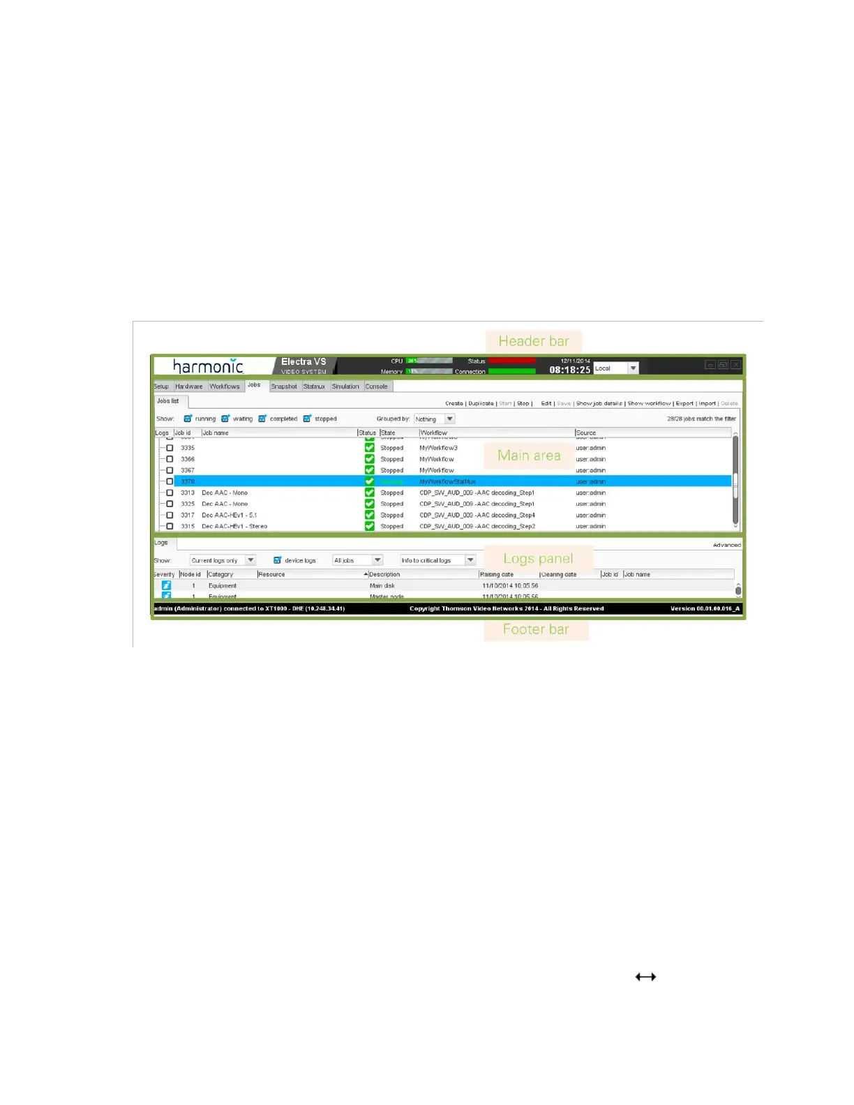An header bar that provides information on the equipment status, the