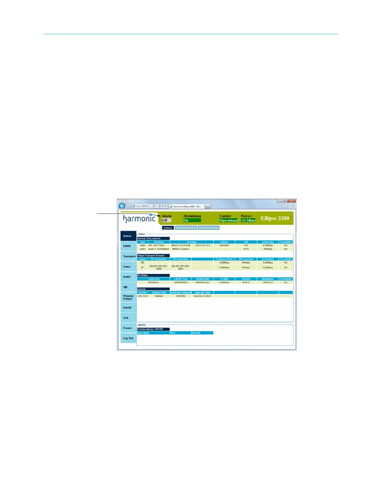 the Ellipse 3200, the Web Manager also displays Modulation, Carrier and Power information. See