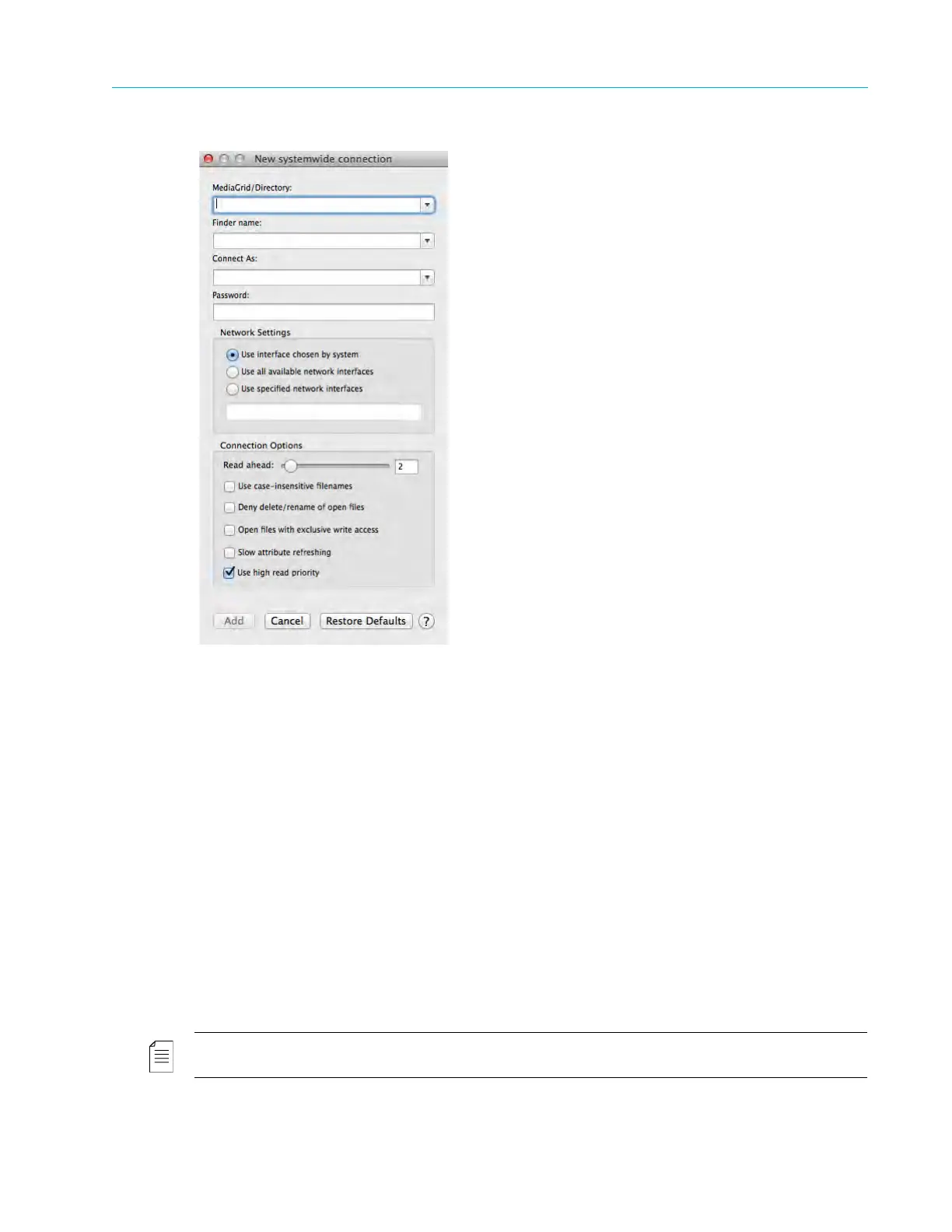 5. Configure any Network Settings or Connection Options (see Configuring User Mount Options).