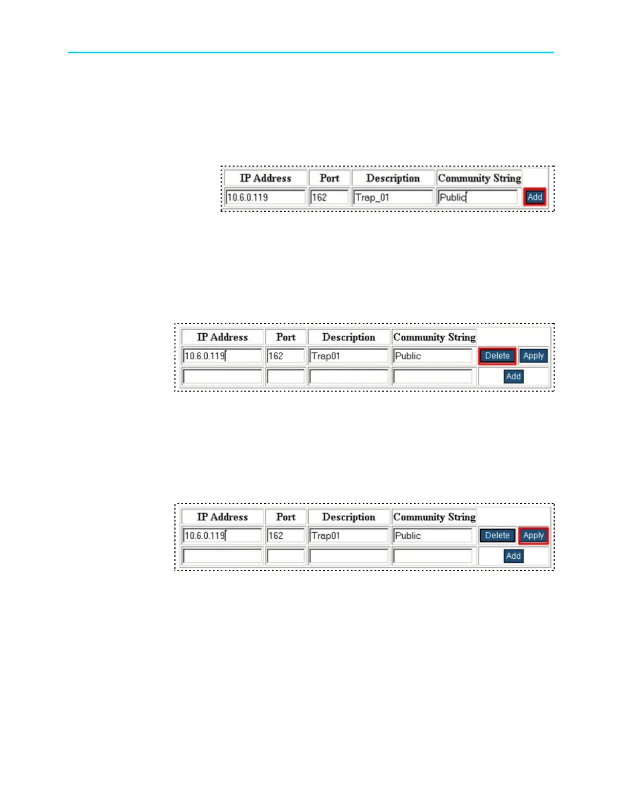 2. In the Trap Table, type valid values for the IP Address, Port, Description (optional)