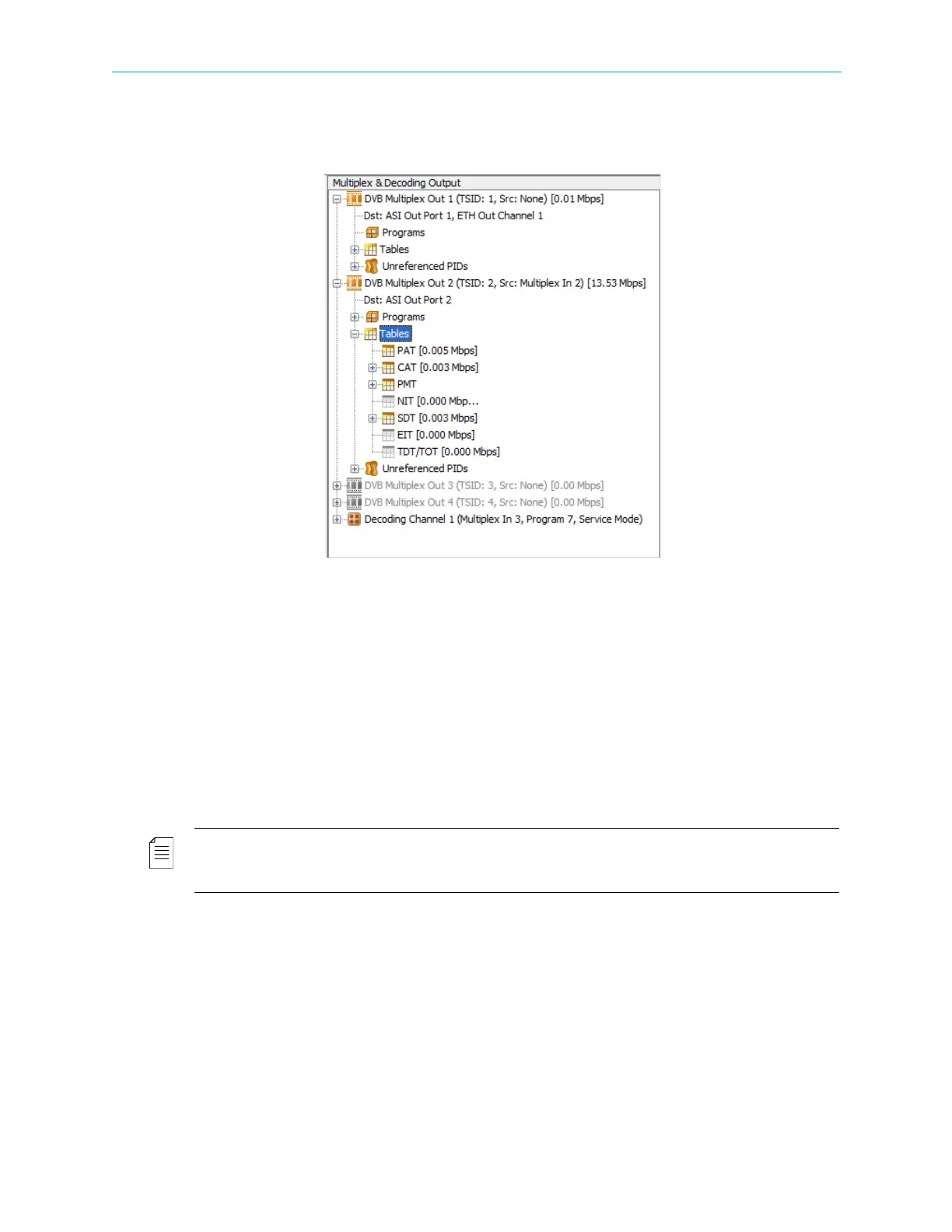 Click a Tables branch in the Multiplex & Decoding Output box to display all the tables related