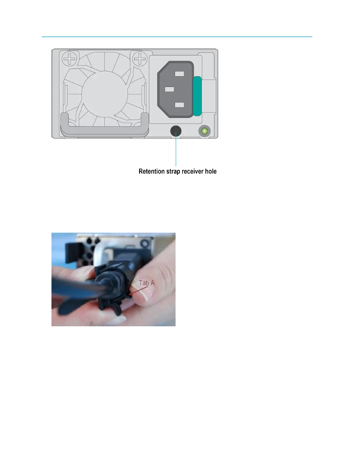 To remove the power cord from the retention strap: push down on the slider tab to release the slider strap,