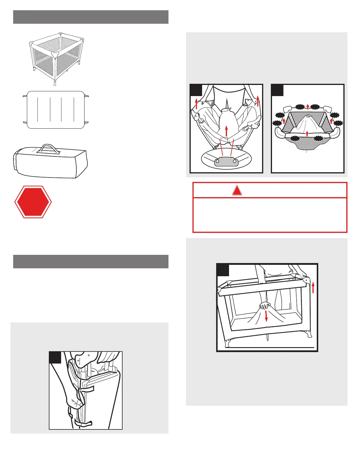 • Remove travel cot/mattress assembly.