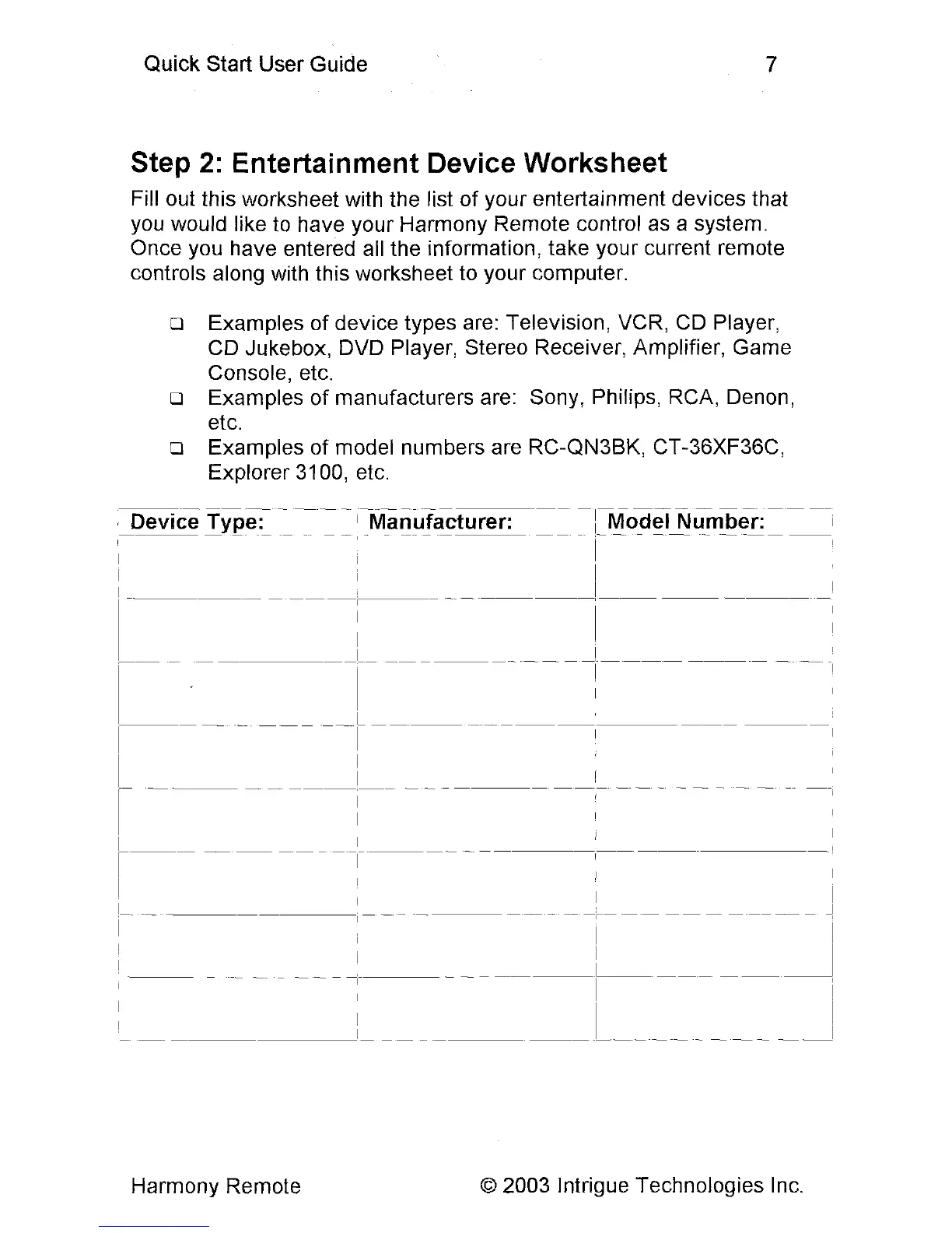 Harmony SST-659 - Step 2: Entertainment Device Worksheet