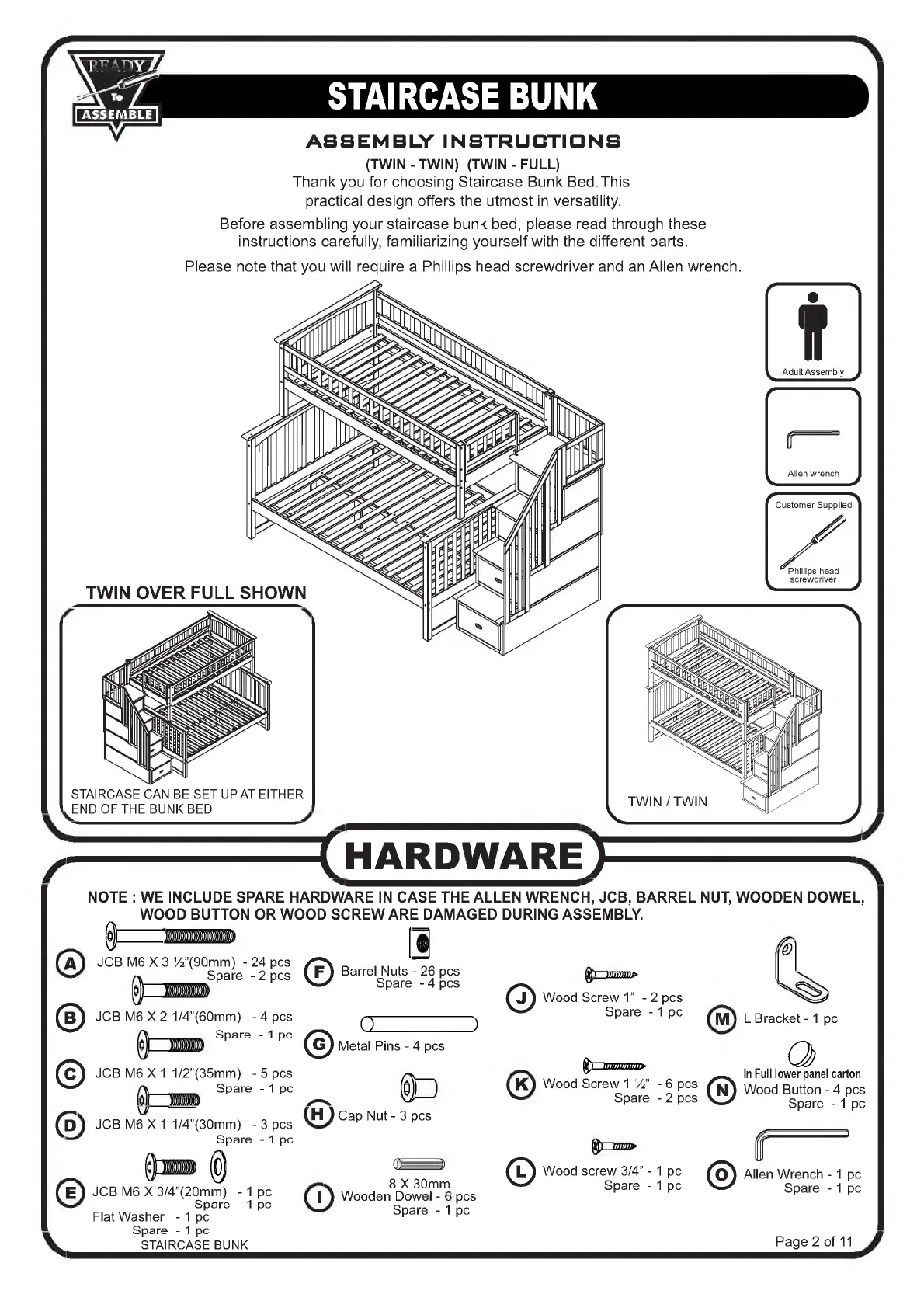NOTE : WE INCLUDE SPARE HARDWARE IN CASE THE ALLEN WRENCH, JCB, BARREL NUT, WOODEN DOWEL,