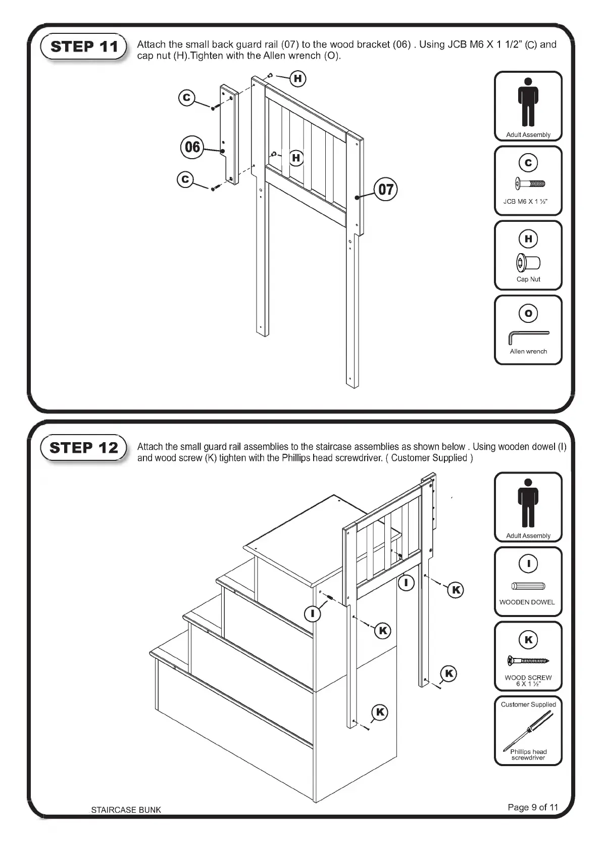 Attach the small guard rail assemblies to the staircase assemblies as shown below . Using wooden dowel (I)