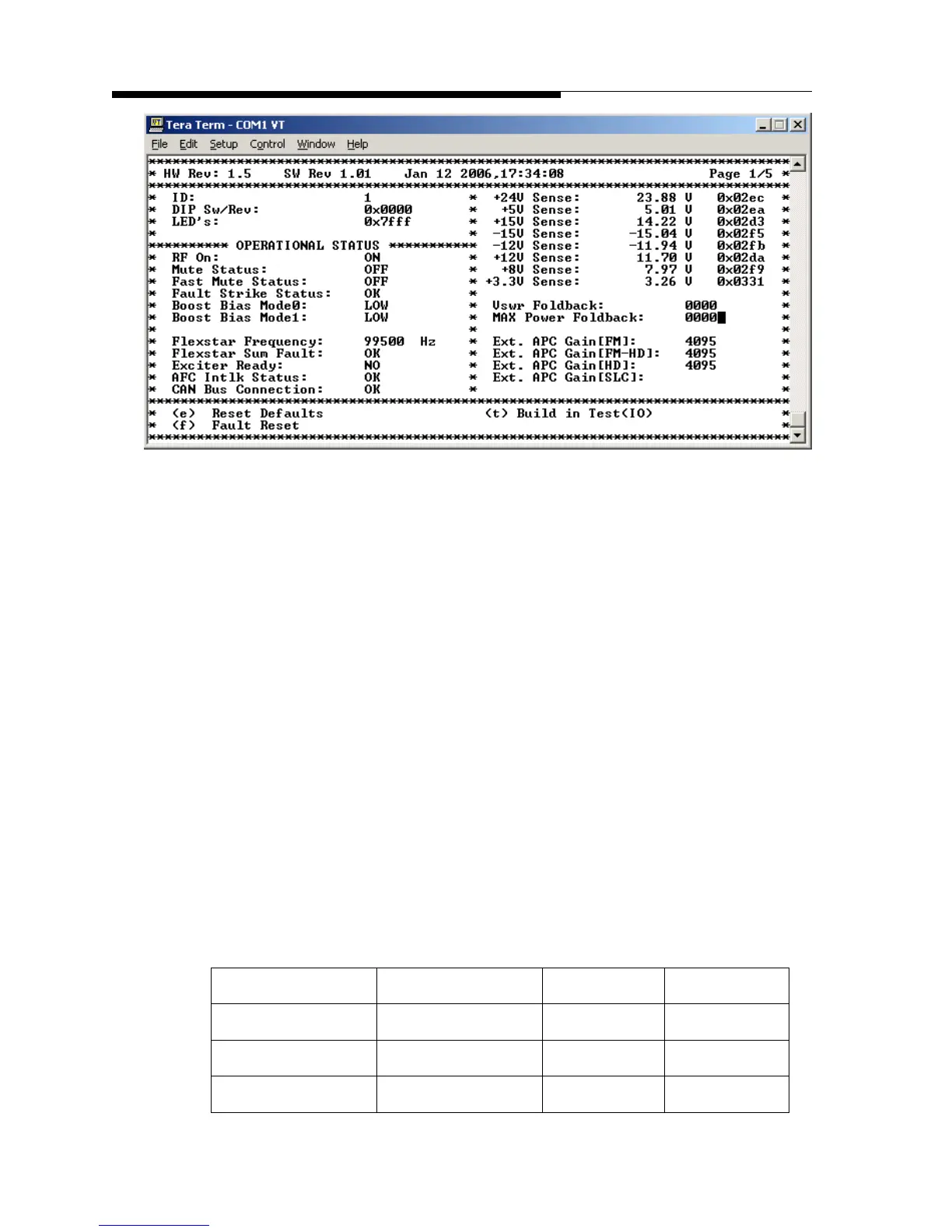 RF On: (ON/OFF) Status of the RF output, when “ON” there are no faults preventing