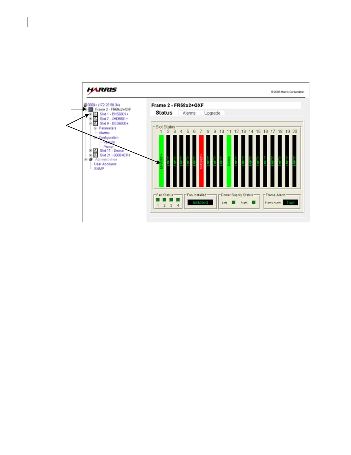 The Frame View pane has three tabs: Status, Alarms, and Upgrade.