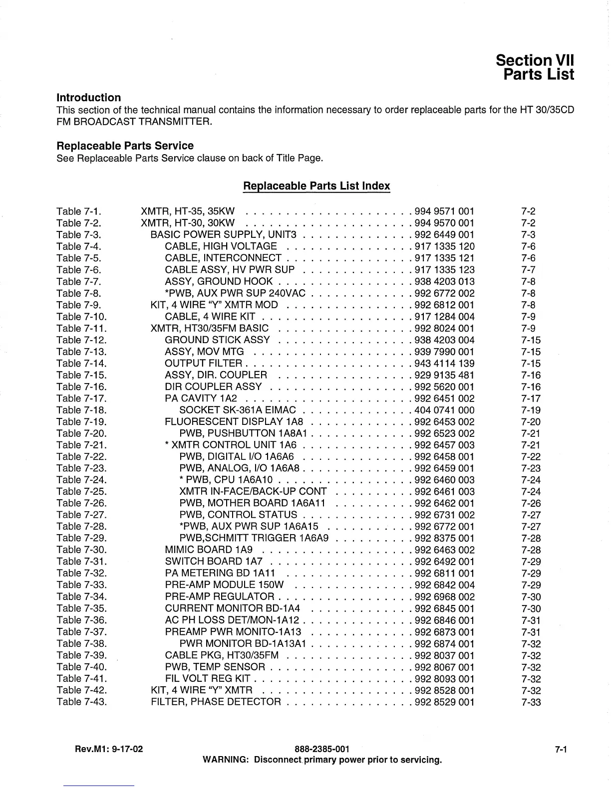 This section of the technical manual contains the information necessary to order replaceable parts for the HT 30/35CD