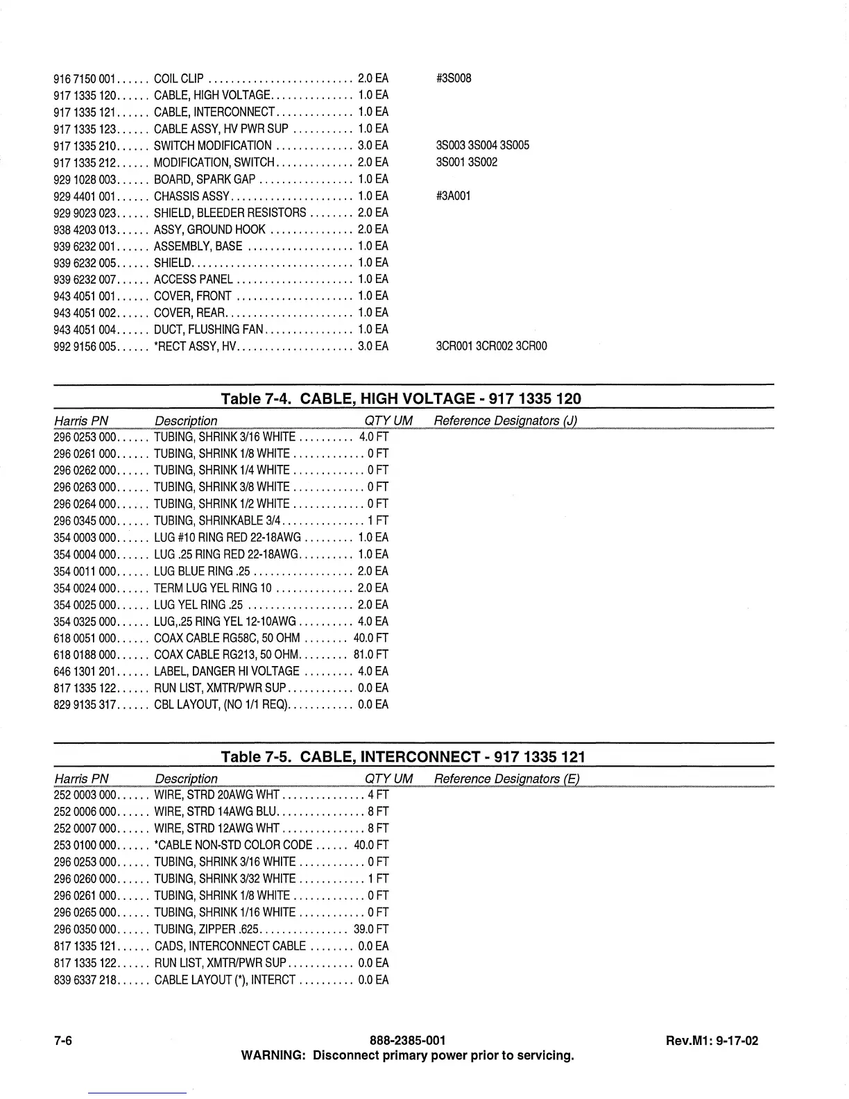 Table 7-4. CABLE, HIGH VOLTAGE -