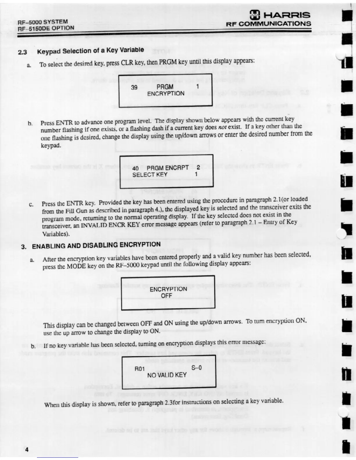 Harris RF-5000 - Keypad Selection of a Key Variable; Enabling and Disabling Encryption; Enabling and Disabling Encryption Operation