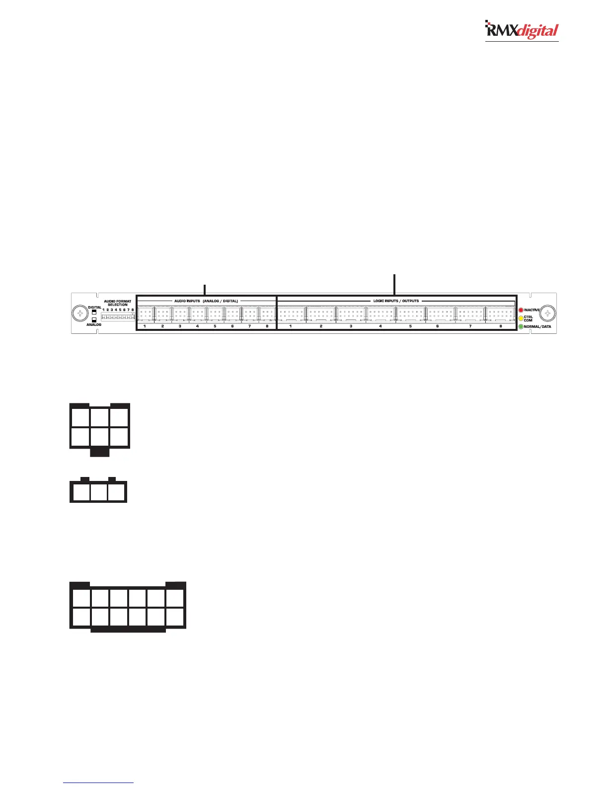 The eight 6-pin audio connectors are individually set as an analog or a digital input by the eight Audio Format DIP