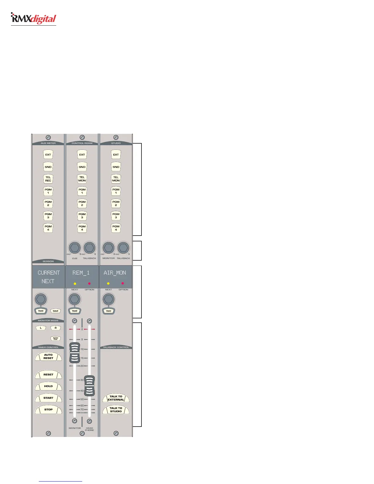 column has the studio monitoring controls (monitor source selectors and level controls for studio speakers). Each