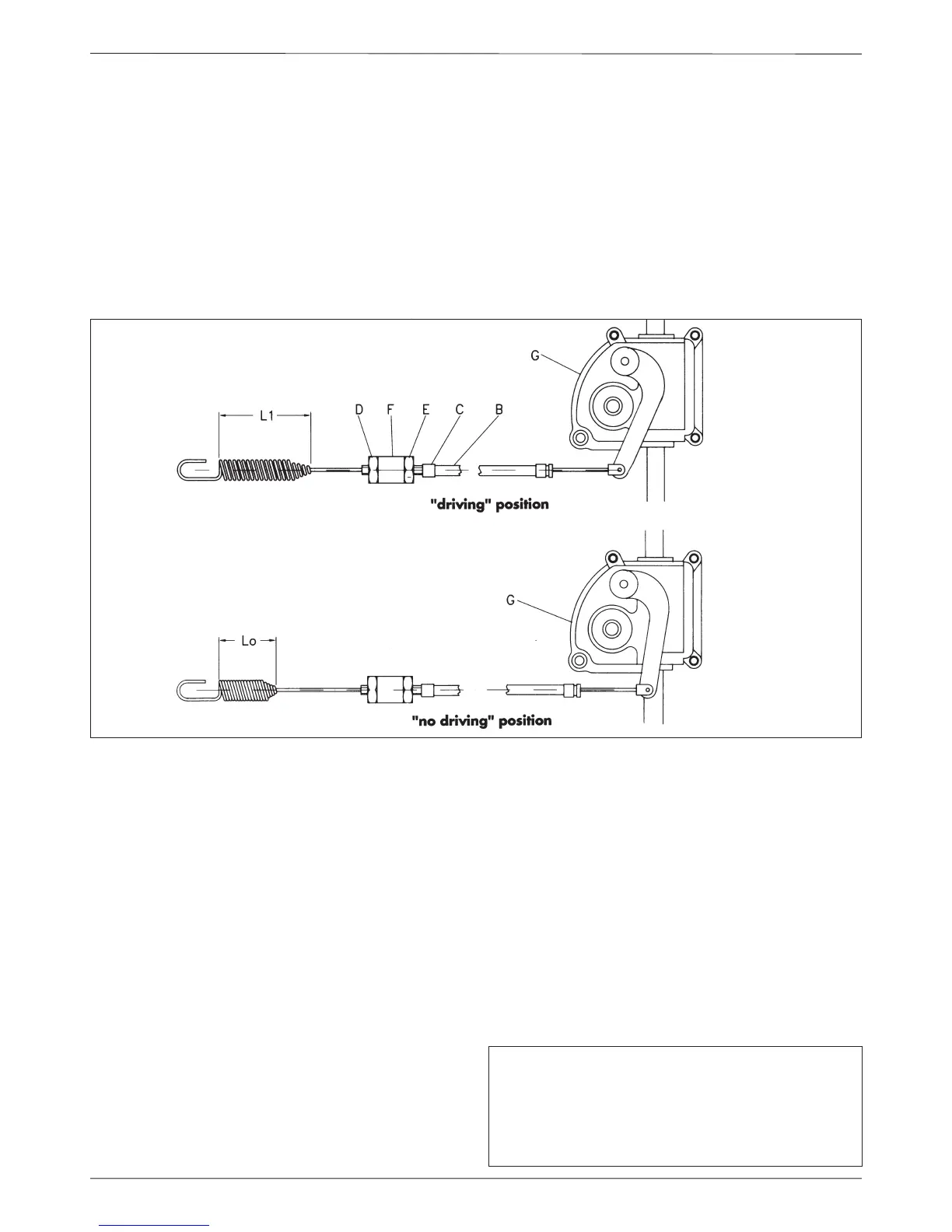 bevindt. De kabel "B" verbindt de aandrijving "G" (die zich op de maaier
