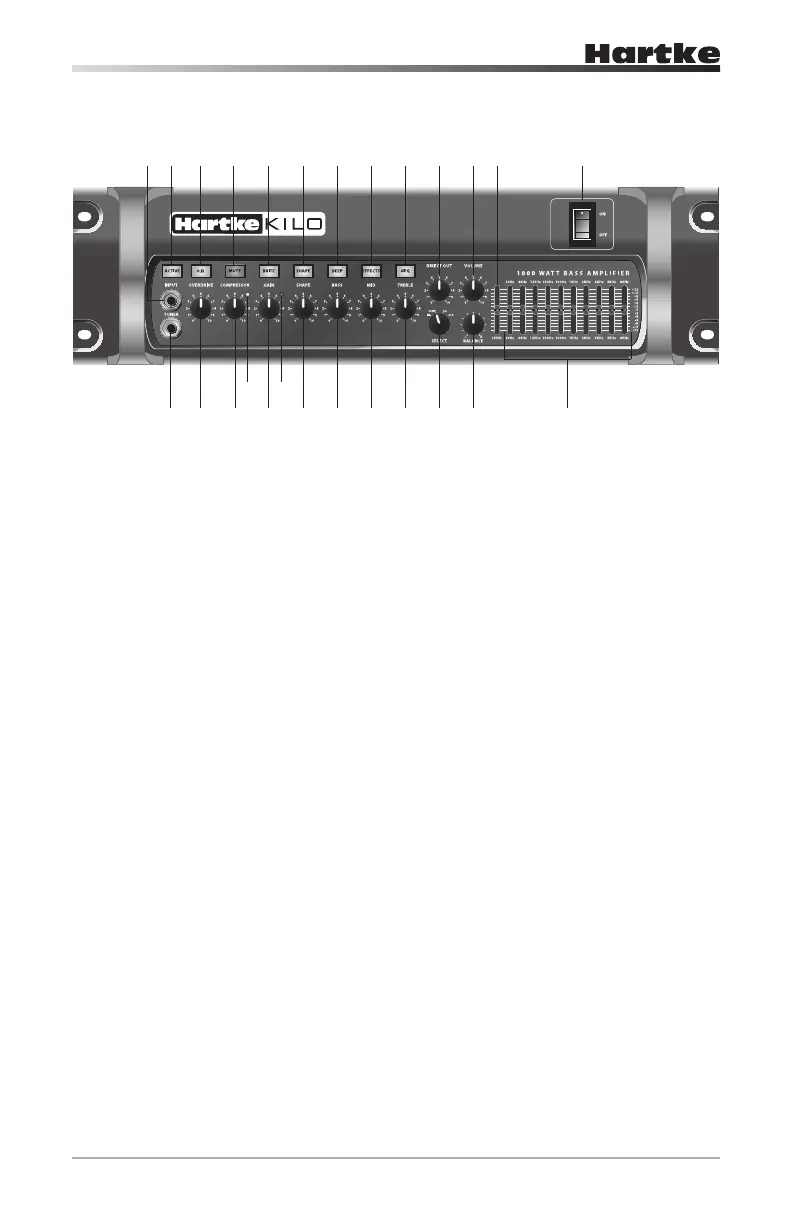 1. INPUT – Connect your bass guitar here using a standard ¼” unbalanced instru-
